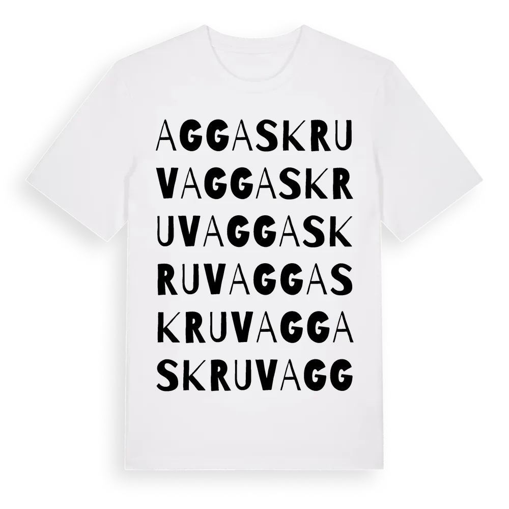 Aggaskruv ordlek t-shirt är inspirerad av Aggaskruv i Jönköpings län, Sverige. Tröjan är designad för dig som har en speciell koppling till platsen – oavsett om du bor här, har rötterna här eller bara älskar Aggaskruv.