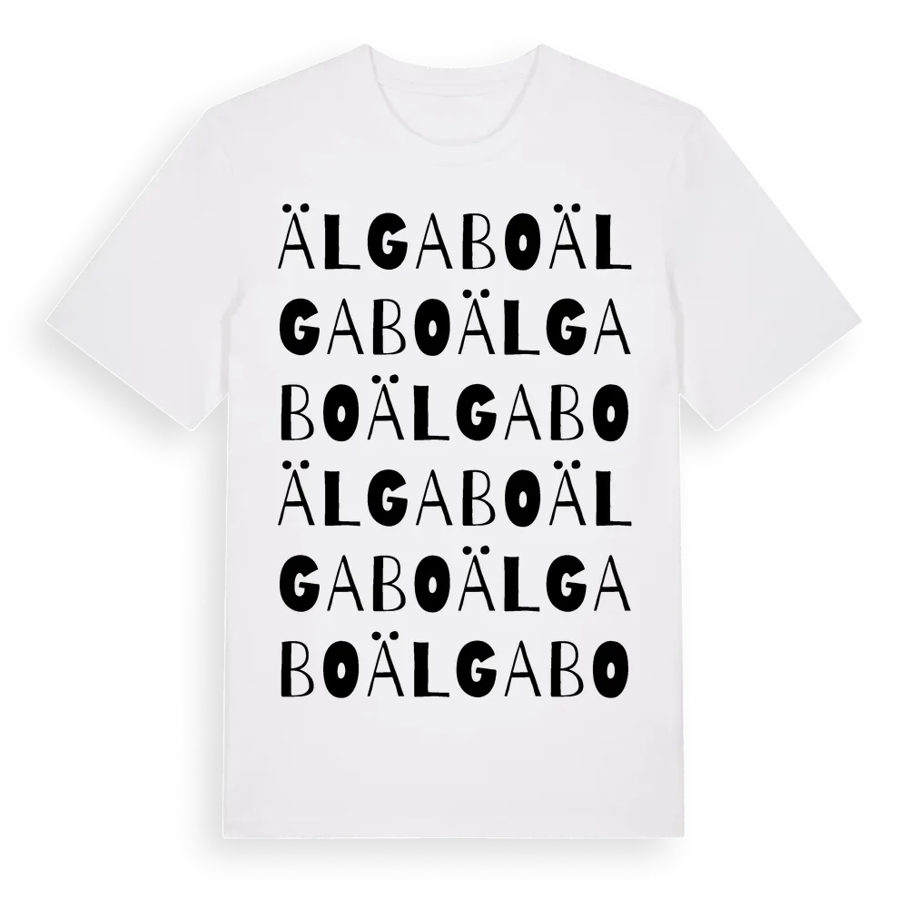 Älgabo ordlek t-shirt är inspirerad av Älgabo i Jönköpings län, Sverige. Tröjan är designad för dig som har en speciell koppling till platsen – oavsett om du bor här, har rötterna här eller bara älskar Älgabo.