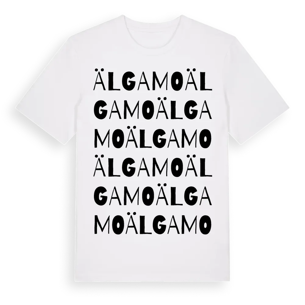 Älgamo ordlek t-shirt är inspirerad av Älgamo i Jönköpings län, Sverige. Tröjan är designad för dig som har en speciell koppling till platsen – oavsett om du bor här, har rötterna här eller bara älskar Älgamo.