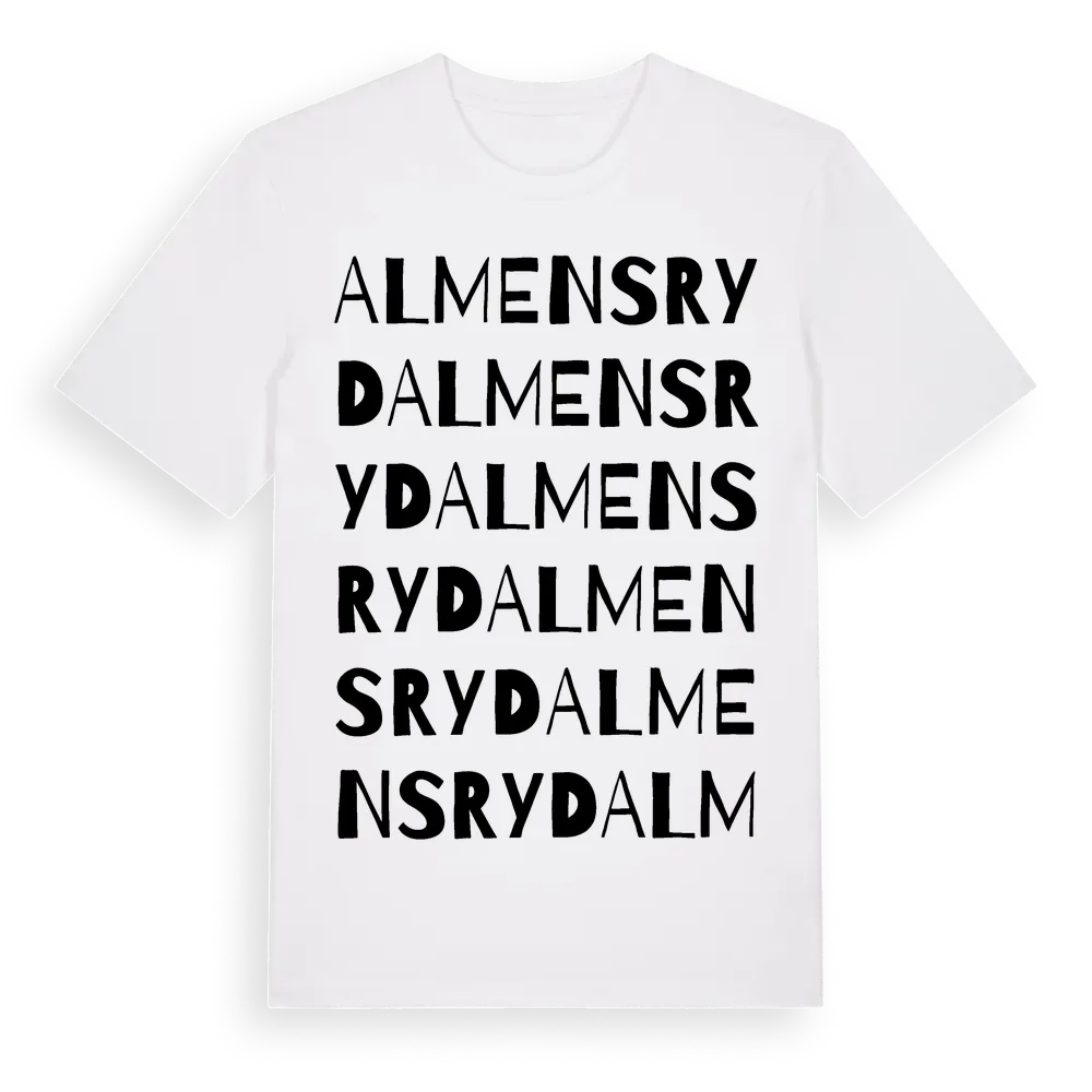 Almensryd ordlek t-shirt är inspirerad av Almensryd i Jönköpings län, Sverige. Tröjan är designad för dig som har en speciell koppling till platsen – oavsett om du bor här, har rötterna här eller bara älskar Almensryd.