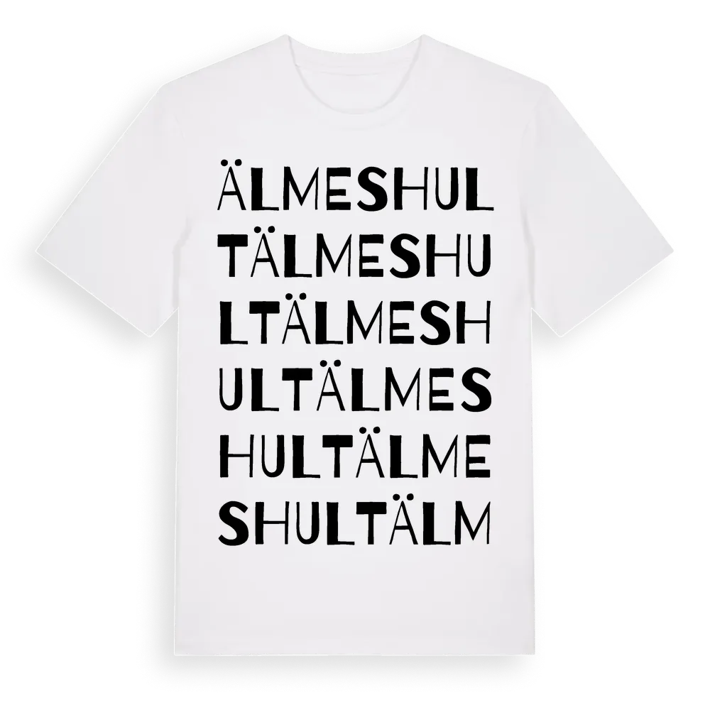 Älmeshult ordlek t-shirt är inspirerad av byn Älmeshult i Jönköpings län, Sverige. Tröjan är designad för dig som har en speciell koppling till platsen – oavsett om du bor här, har rötterna här eller bara älskar Älmeshult.