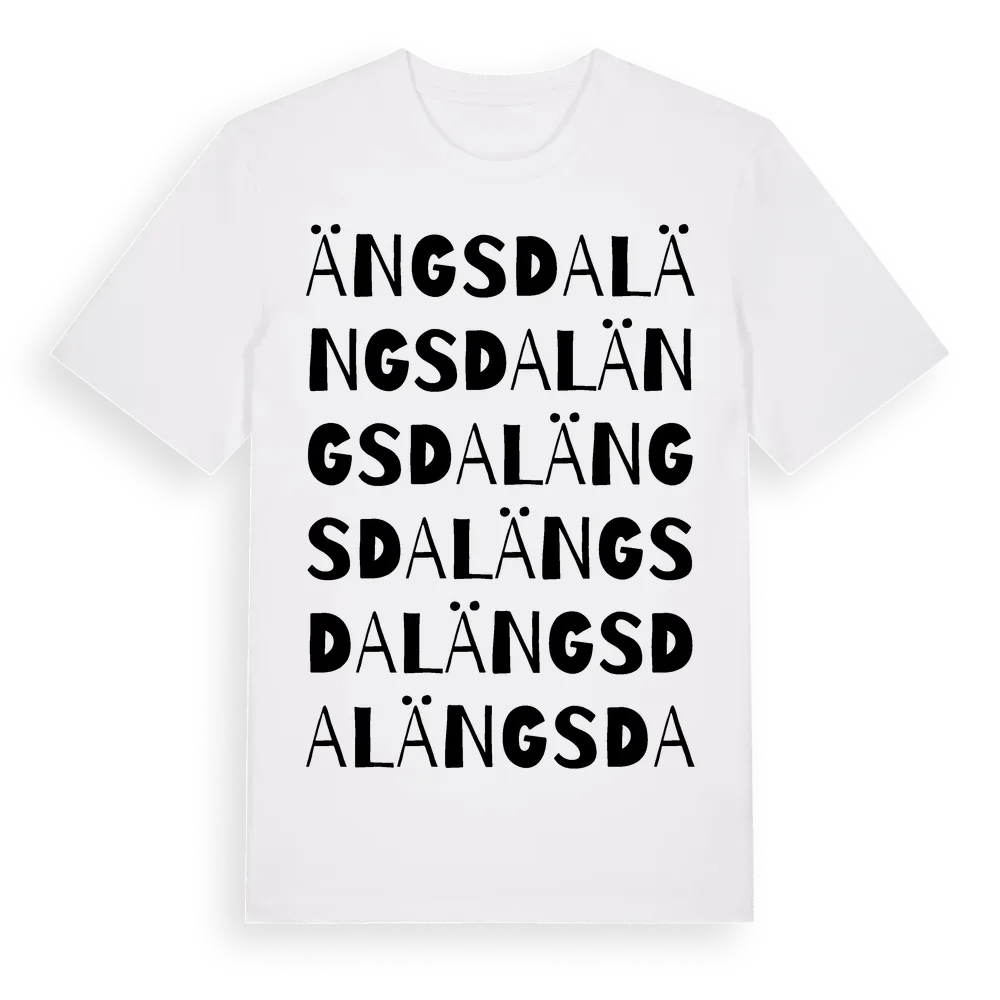 Ängsdal ordlek t-shirt är inspirerad av Ängsdal i Jönköpings län, Sverige. Tröjan är designad för dig som har en speciell koppling till platsen – oavsett om du bor här, har rötterna här eller bara älskar Ängsdal.