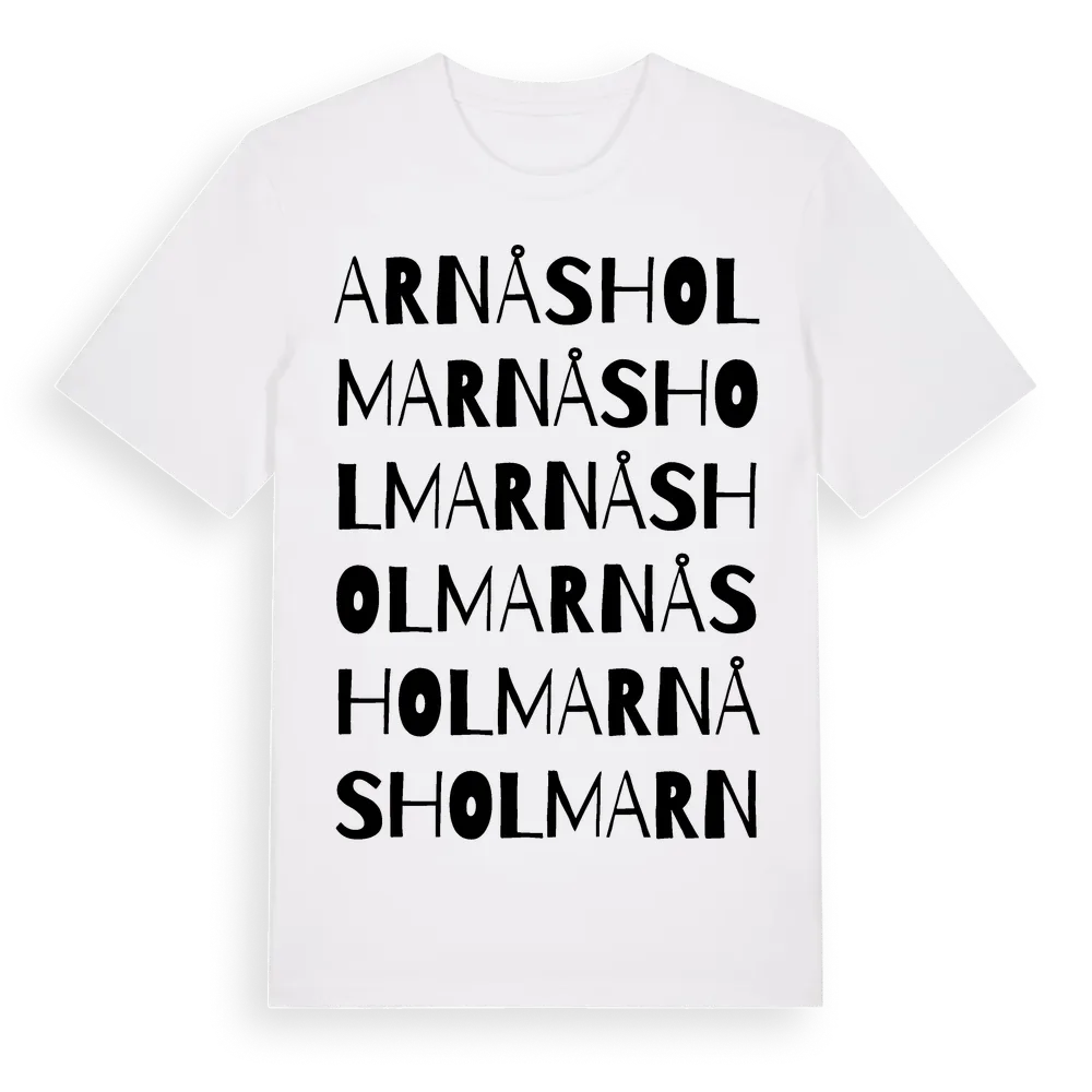 Arnåsholm ordlek t-shirt är inspirerad av byn Arnåsholm i Jönköpings län, Sverige. Tröjan är designad för dig som har en speciell koppling till platsen – oavsett om du bor här, har rötterna här eller bara älskar Arnåsholm.