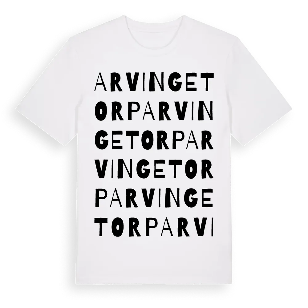 Arvingetorp ordlek t-shirt är inspirerad av byn Arvingetorp i Jönköpings län, Sverige. Tröjan är designad för dig som har en speciell koppling till platsen – oavsett om du bor här, har rötterna här eller bara älskar Arvingetorp.