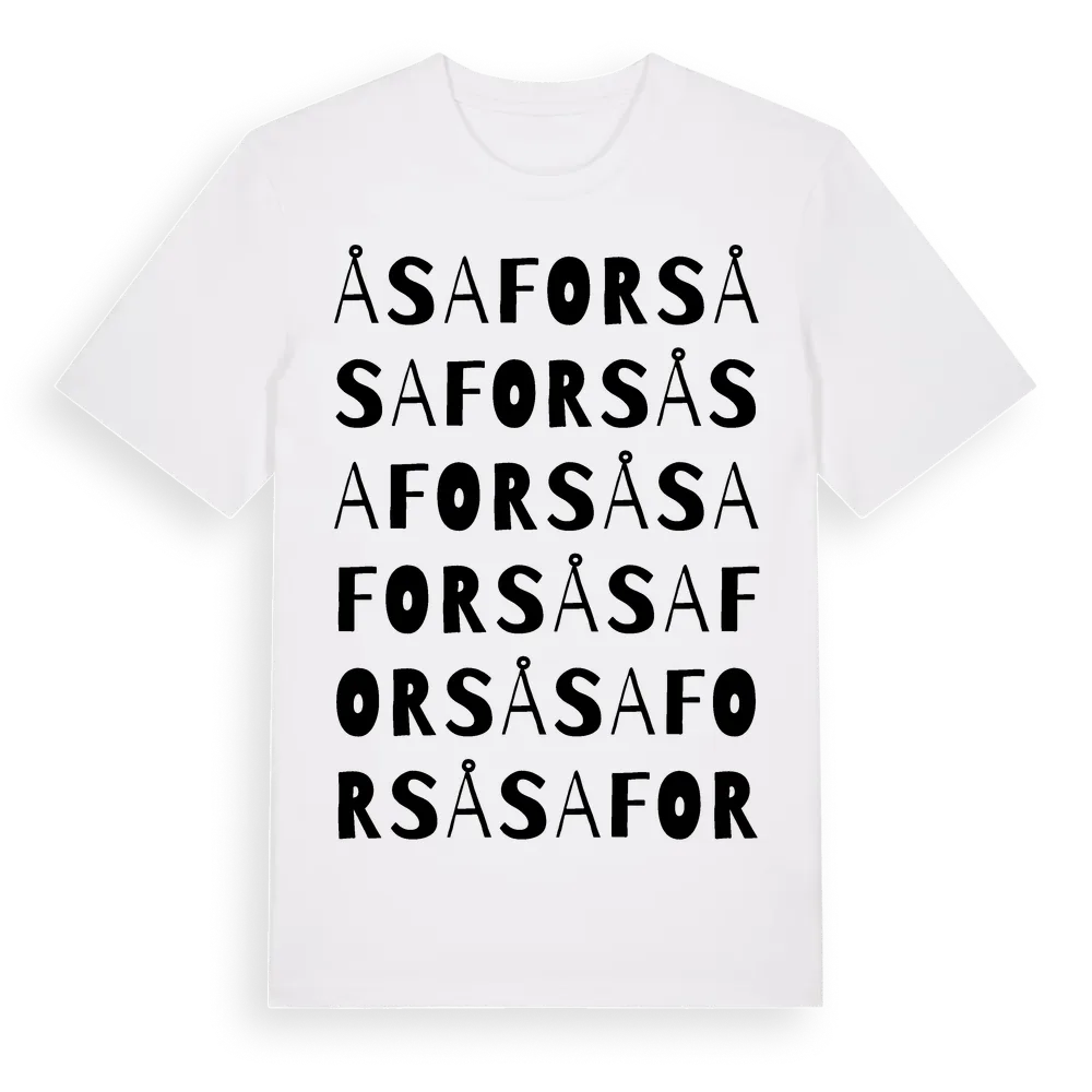 Åsafors ordlek t-shirt är inspirerad av stadsdelen Åsafors i Jönköpings län, Sverige. Tröjan är designad för dig som har en speciell koppling till platsen – oavsett om du bor här, har rötterna här eller bara älskar Åsafors.
