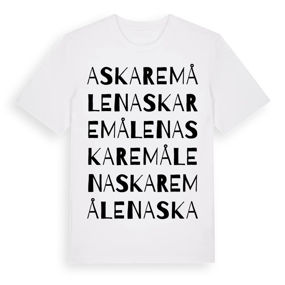 Askaremålen ordlek t-shirt är inspirerad av Askaremålen i Jönköpings län, Sverige. Tröjan är designad för dig som har en speciell koppling till platsen – oavsett om du bor här, har rötterna här eller bara älskar Askaremålen.