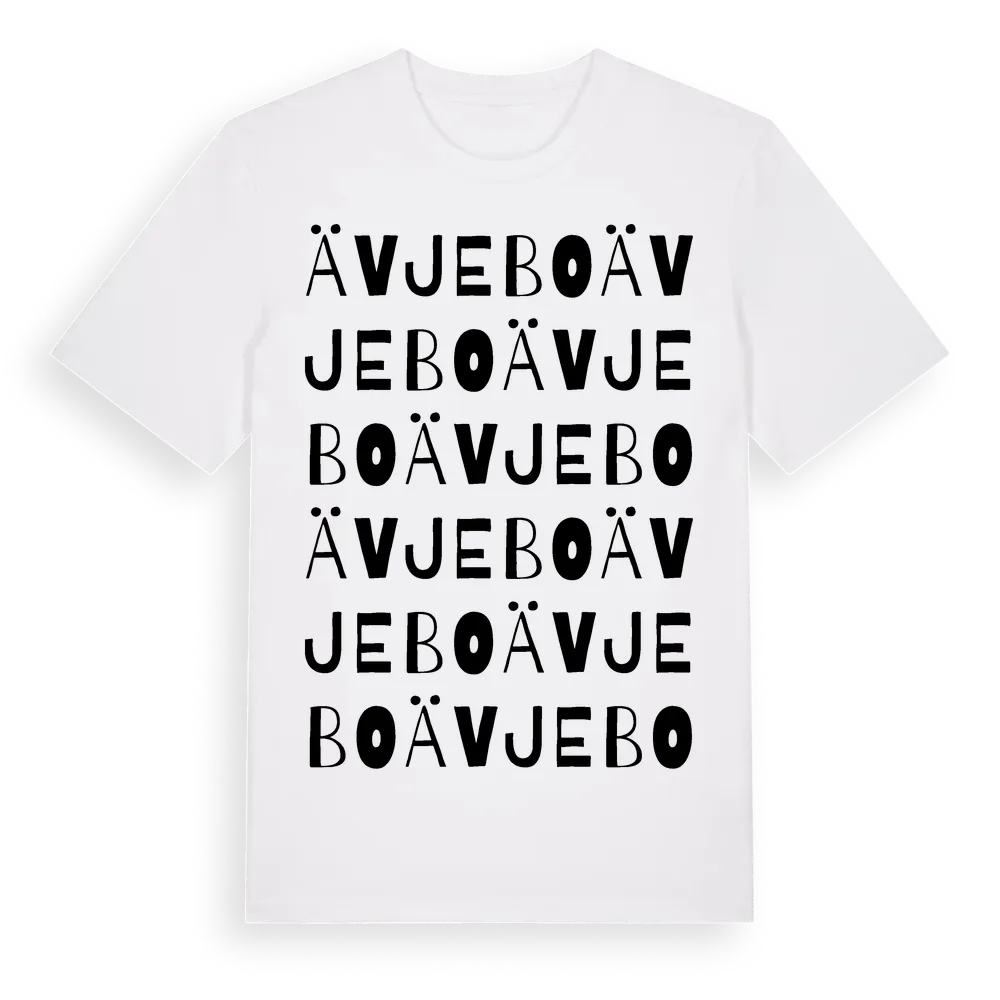 Ävjebo ordlek t-shirt är inspirerad av Ävjebo i Jönköpings län, Sverige. Tröjan är designad för dig som har en speciell koppling till platsen – oavsett om du bor här, har rötterna här eller bara älskar Ävjebo.