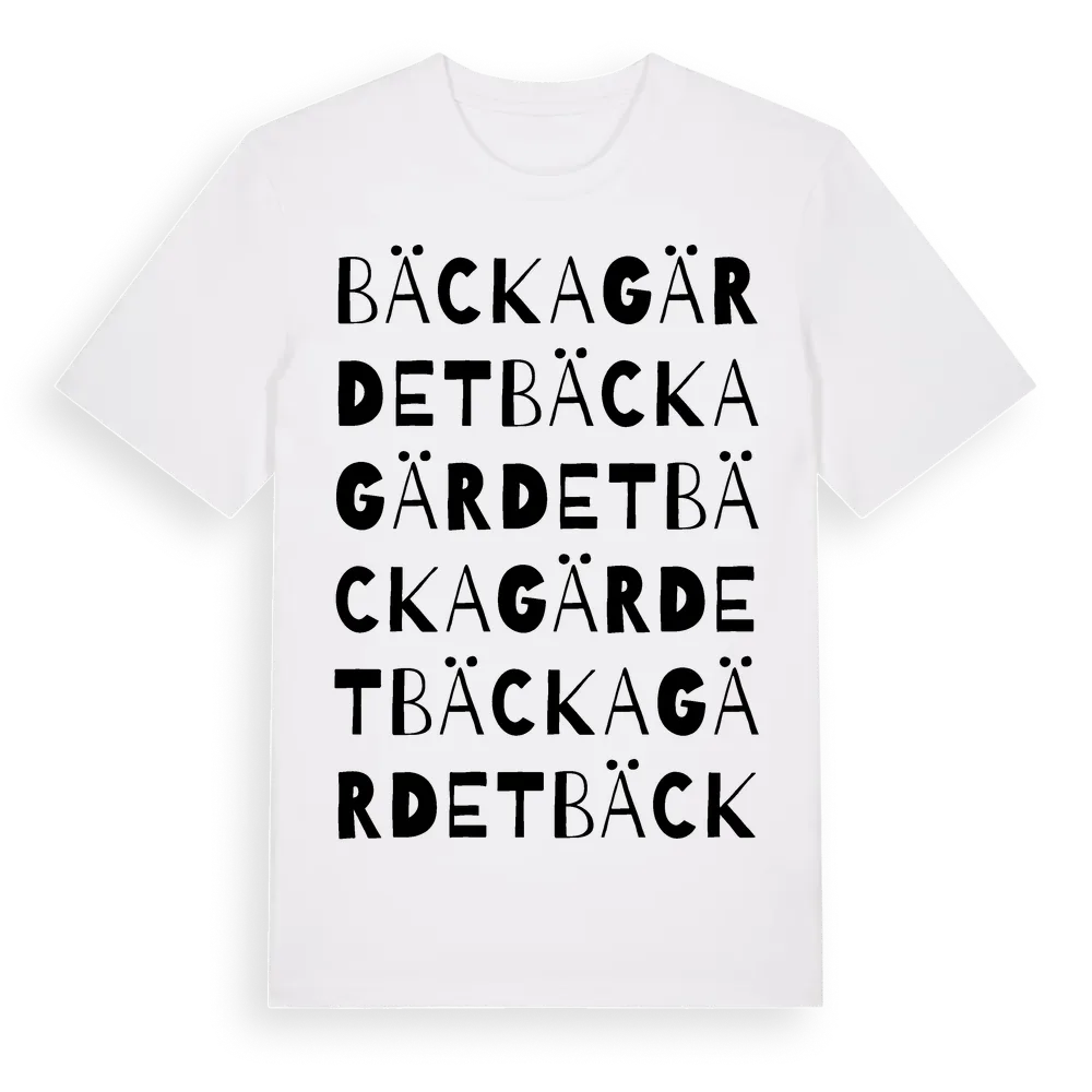 Bäckagärdet ordlek t-shirt är inspirerad av Bäckagärdet i Jönköpings län, Sverige. Tröjan är designad för dig som har en speciell koppling till platsen – oavsett om du bor här, har rötterna här eller bara älskar Bäckagärdet.