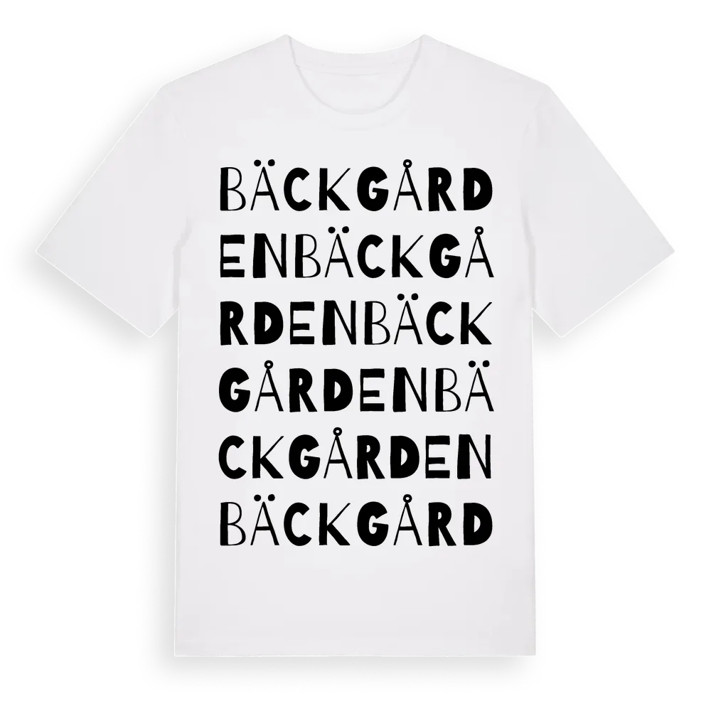 Bäckgården ordlek t-shirt är inspirerad av Bäckgården i Jönköpings län, Sverige. Tröjan är designad för dig som har en speciell koppling till platsen – oavsett om du bor här, har rötterna här eller bara älskar Bäckgården.