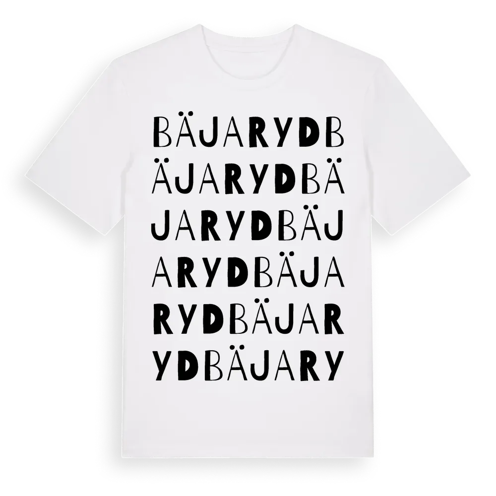 Bäjaryd ordlek t-shirt är inspirerad av byn Bäjaryd i Jönköpings län, Sverige. Tröjan är designad för dig som har en speciell koppling till platsen – oavsett om du bor här, har rötterna här eller bara älskar Bäjaryd.