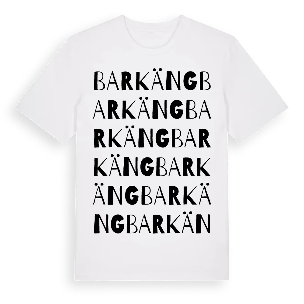 Barkäng ordlek t-shirt är inspirerad av byn Barkäng i Jönköpings län, Sverige. Tröjan är designad för dig som har en speciell koppling till platsen – oavsett om du bor här, har rötterna här eller bara älskar Barkäng.