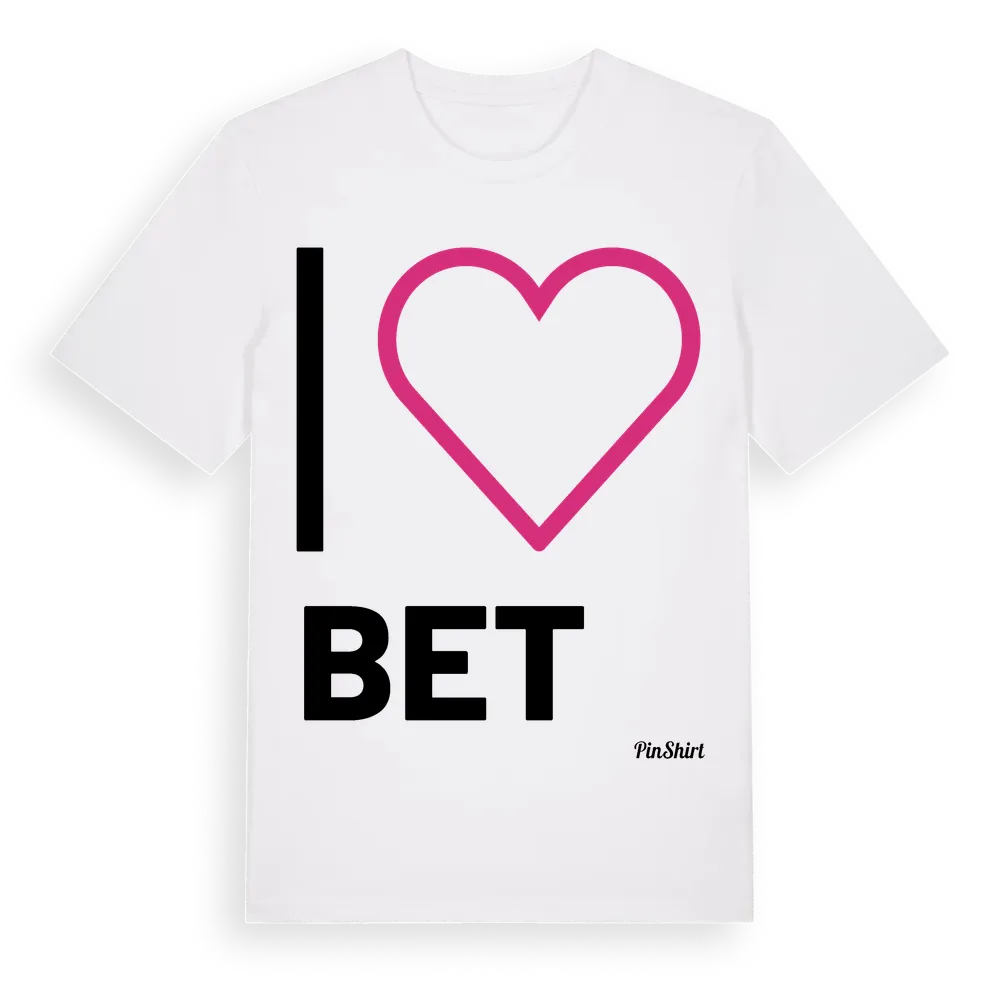 Det klassiska "I ❤ Bet"-motivet i stort format som täcker hela bröstet. För dig som vill visa kärleken till Bet på riktigt. Premium bomull, unisex – från byn Bet i Jönköpings län.
