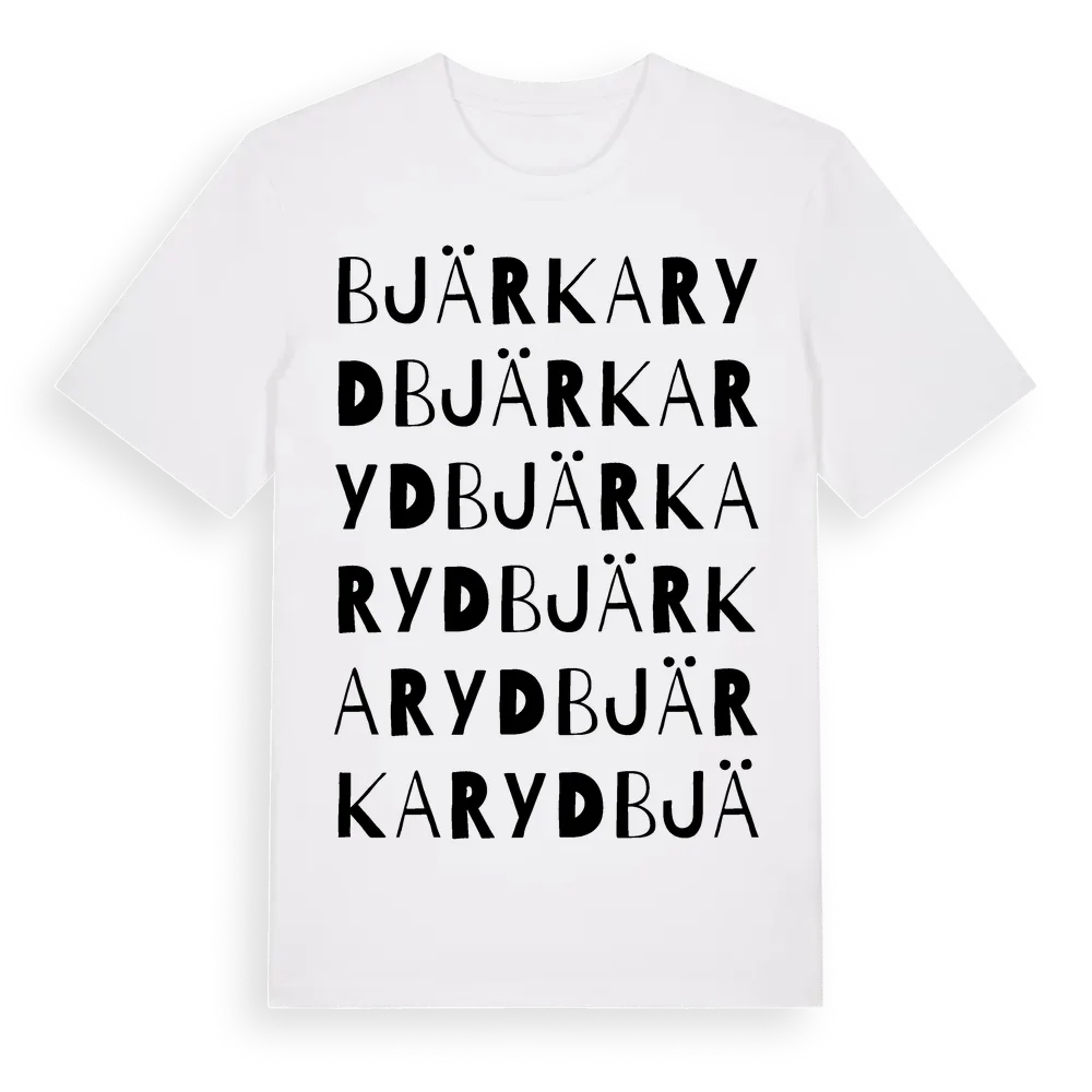 Bjärkaryd ordlek t-shirt är inspirerad av Bjärkaryd i Jönköpings län, Sverige. Tröjan är designad för dig som har en speciell koppling till platsen – oavsett om du bor här, har rötterna här eller bara älskar Bjärkaryd.