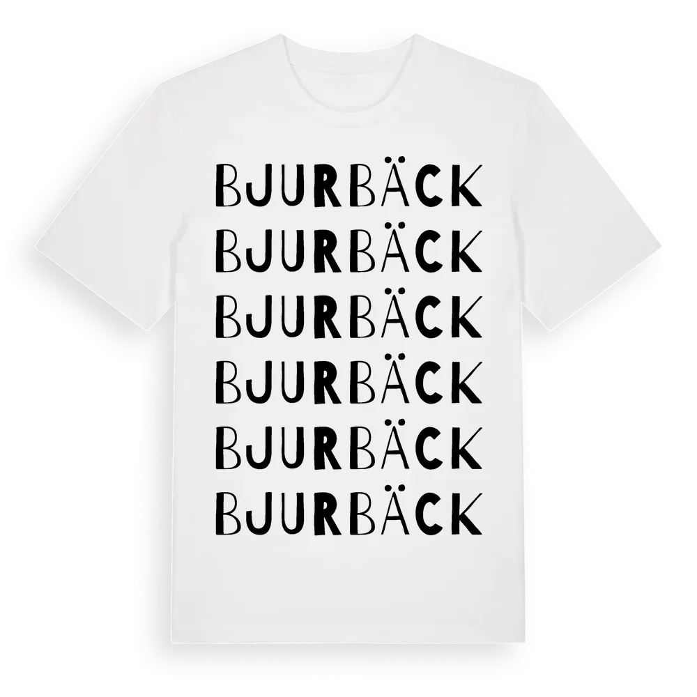 Bjurbäck ordlek t-shirt är inspirerad av byn Bjurbäck i Jönköpings län, Sverige. Tröjan är designad för dig som har en speciell koppling till platsen – oavsett om du bor här, har rötterna här eller bara älskar Bjurbäck.