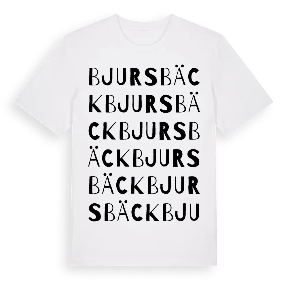 Bjursbäck ordlek t-shirt är inspirerad av Bjursbäck i Jönköpings län, Sverige. Tröjan är designad för dig som har en speciell koppling till platsen – oavsett om du bor här, har rötterna här eller bara älskar Bjursbäck.