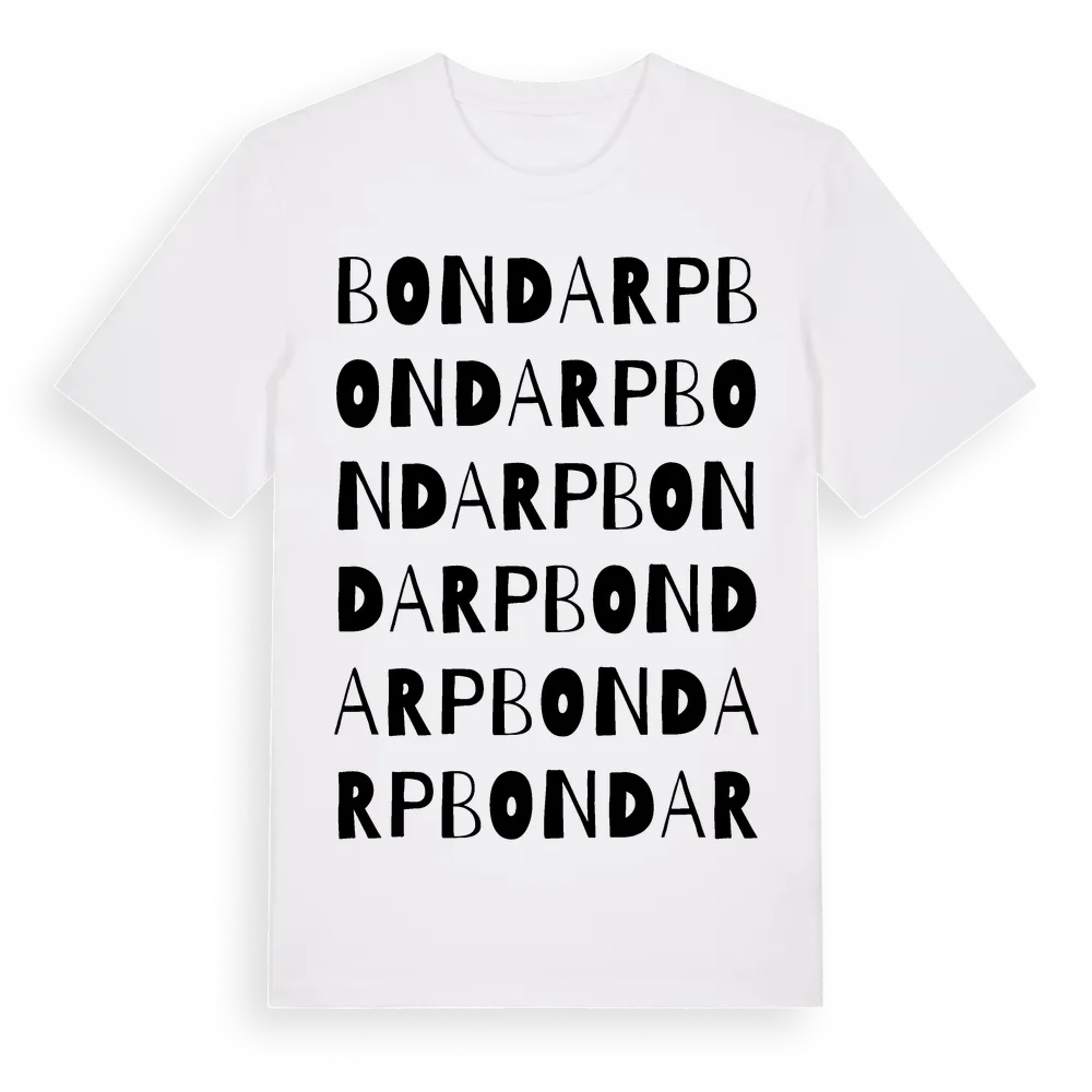 Bondarp ordlek t-shirt är inspirerad av byn Bondarp i Jönköpings län, Sverige. Tröjan är designad för dig som har en speciell koppling till platsen – oavsett om du bor här, har rötterna här eller bara älskar Bondarp.