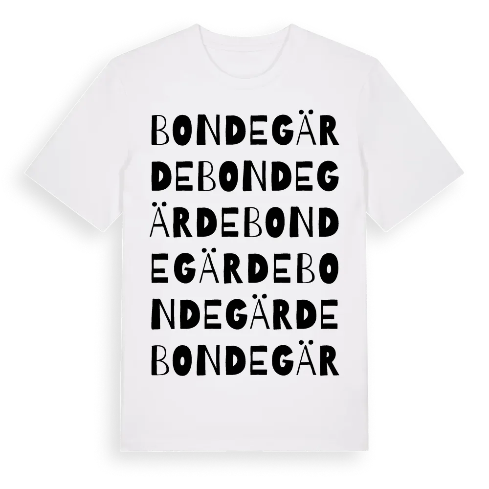 Bondegärde ordlek t-shirt är inspirerad av Bondegärde i Jönköpings län, Sverige. Tröjan är designad för dig som har en speciell koppling till platsen – oavsett om du bor här, har rötterna här eller bara älskar Bondegärde.