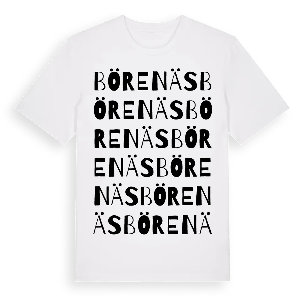 Börenäs ordlek t-shirt är inspirerad av Börenäs i Jönköpings län, Sverige. Tröjan är designad för dig som har en speciell koppling till platsen – oavsett om du bor här, har rötterna här eller bara älskar Börenäs.