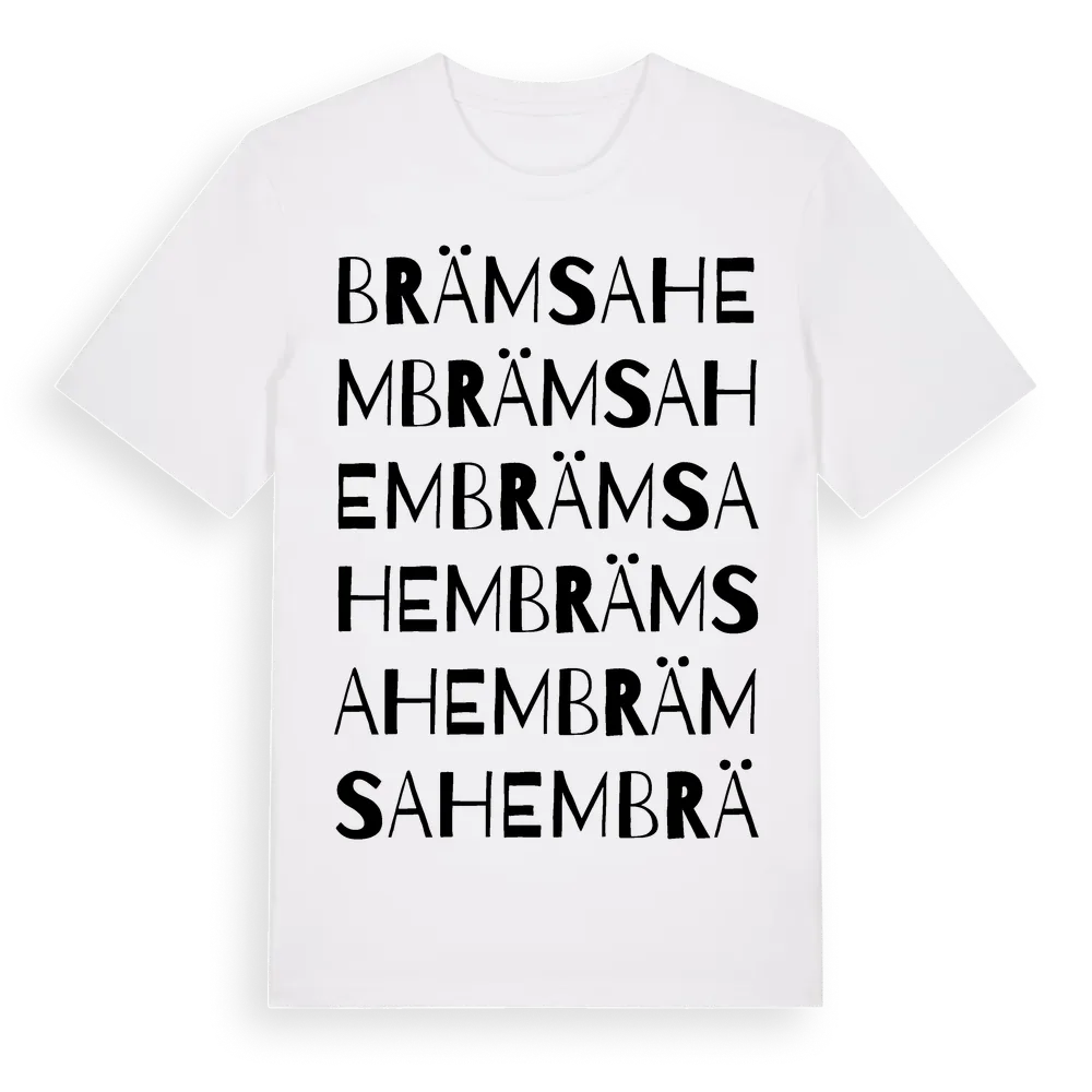 Brämsahem ordlek t-shirt är inspirerad av Brämsahem i Jönköpings län, Sverige. Tröjan är designad för dig som har en speciell koppling till platsen – oavsett om du bor här, har rötterna här eller bara älskar Brämsahem.