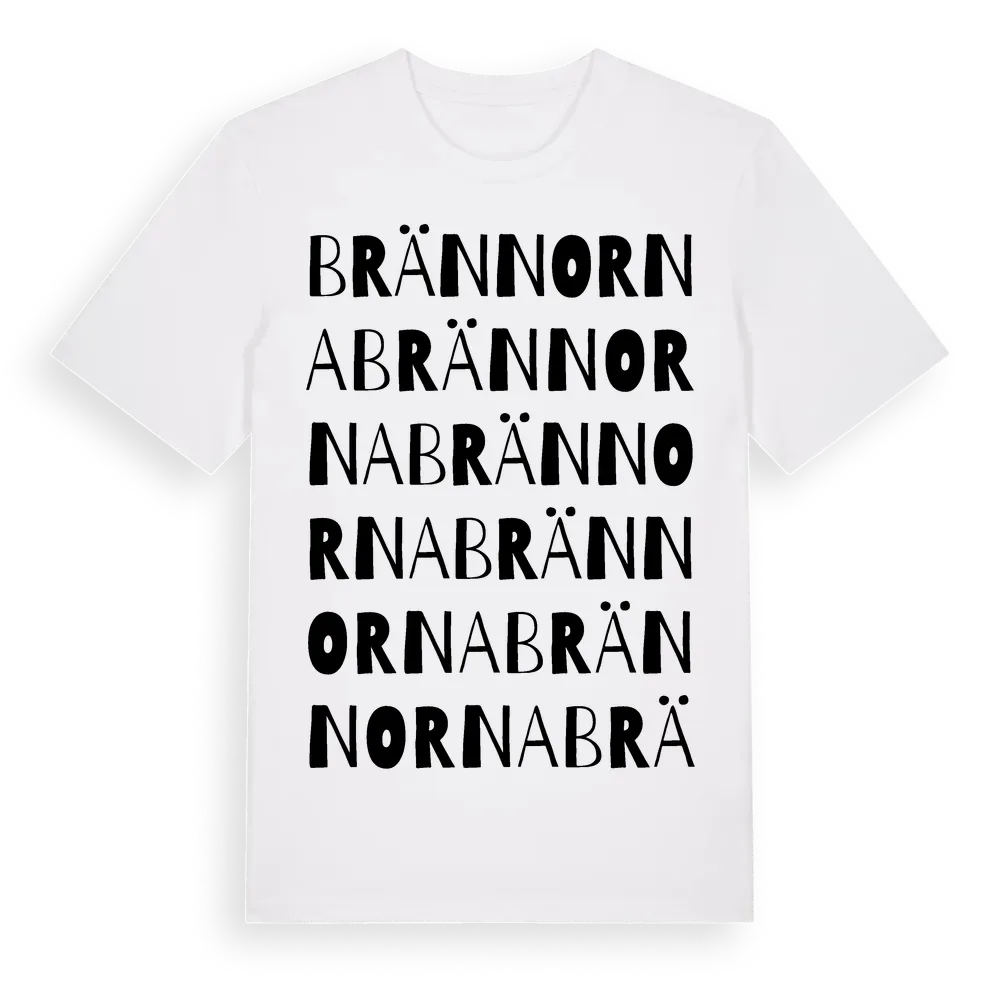 Brännorna ordlek t-shirt är inspirerad av Brännorna i Jönköpings län, Sverige. Tröjan är designad för dig som har en speciell koppling till platsen – oavsett om du bor här, har rötterna här eller bara älskar Brännorna.