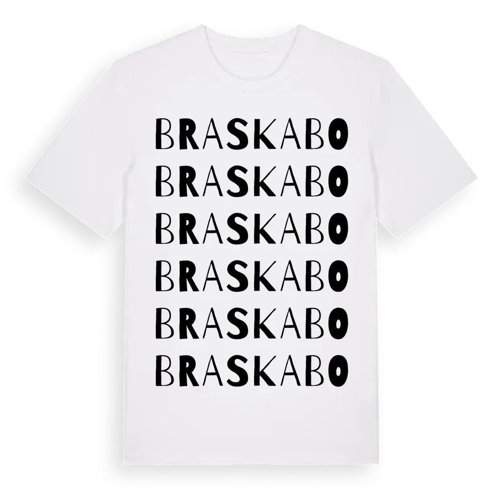 Braskabo ordlek t-shirt är inspirerad av Braskabo i Jönköpings län, Sverige. Tröjan är designad för dig som har en speciell koppling till platsen – oavsett om du bor här, har rötterna här eller bara älskar Braskabo.