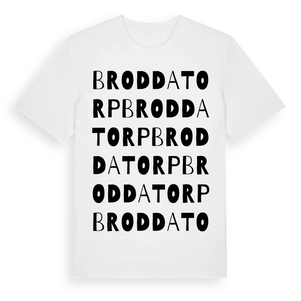 Broddatorp ordlek t-shirt är inspirerad av byn Broddatorp i Jönköpings län, Sverige. Tröjan är designad för dig som har en speciell koppling till platsen – oavsett om du bor här, har rötterna här eller bara älskar Broddatorp.