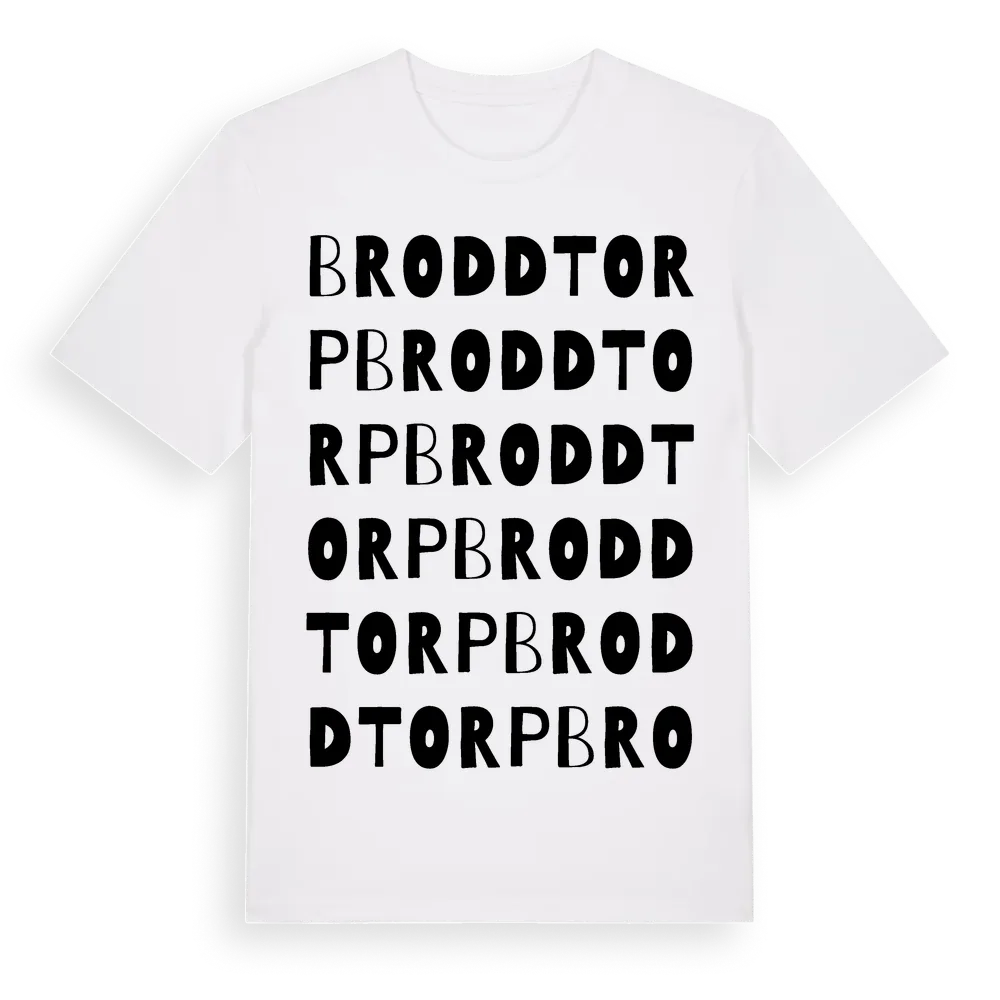 Broddtorp ordlek t-shirt är inspirerad av byn Broddtorp i Jönköpings län, Sverige. Tröjan är designad för dig som har en speciell koppling till platsen – oavsett om du bor här, har rötterna här eller bara älskar Broddtorp.