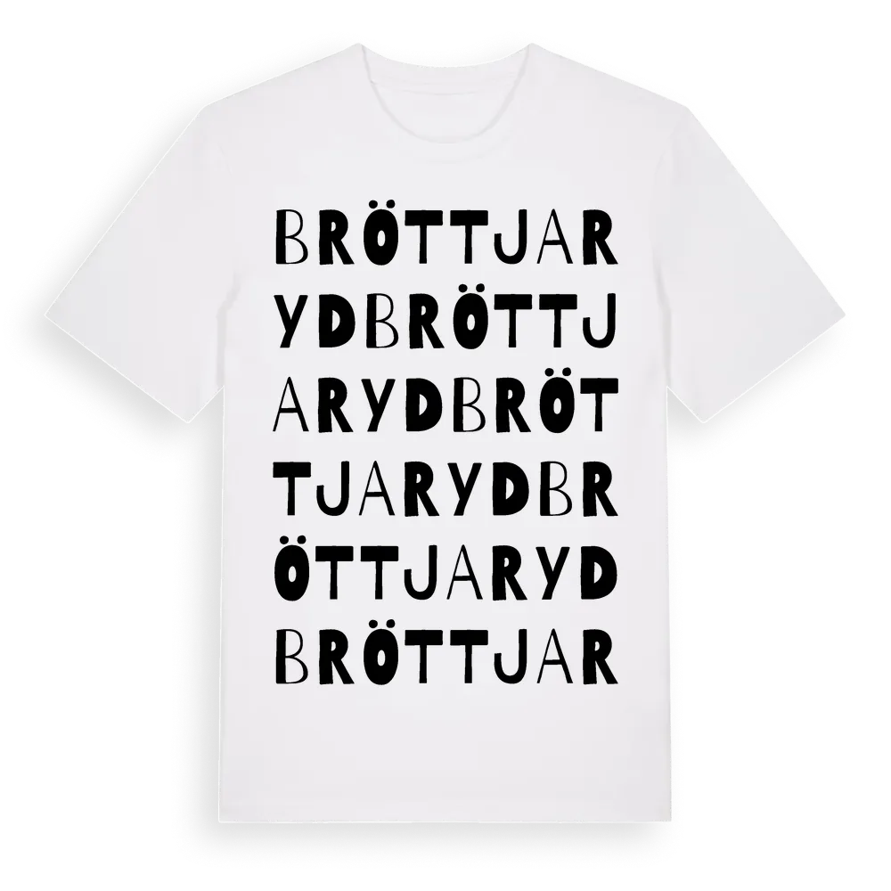Bröttjaryd ordlek t-shirt är inspirerad av byn Bröttjaryd i Jönköpings län, Sverige. Tröjan är designad för dig som har en speciell koppling till platsen – oavsett om du bor här, har rötterna här eller bara älskar Bröttjaryd.