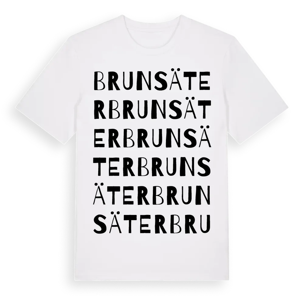 Brunsäter ordlek t-shirt är inspirerad av Brunsäter i Jönköpings län, Sverige. Tröjan är designad för dig som har en speciell koppling till platsen – oavsett om du bor här, har rötterna här eller bara älskar Brunsäter.