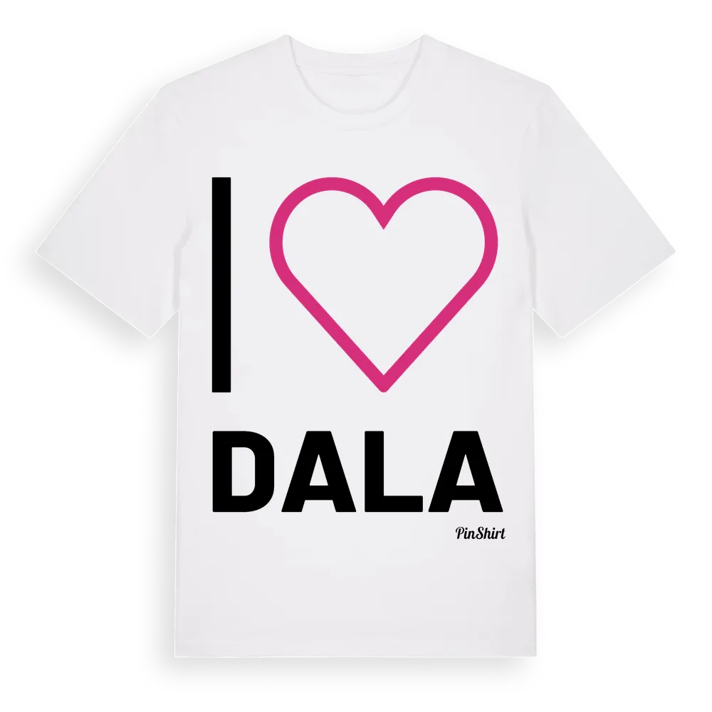 Det klassiska "I ❤ Dala"-motivet i stort format som täcker hela bröstet. För dig som vill visa kärleken till Dala på riktigt. Premium bomull, unisex – från byn Dala i Jönköpings län.