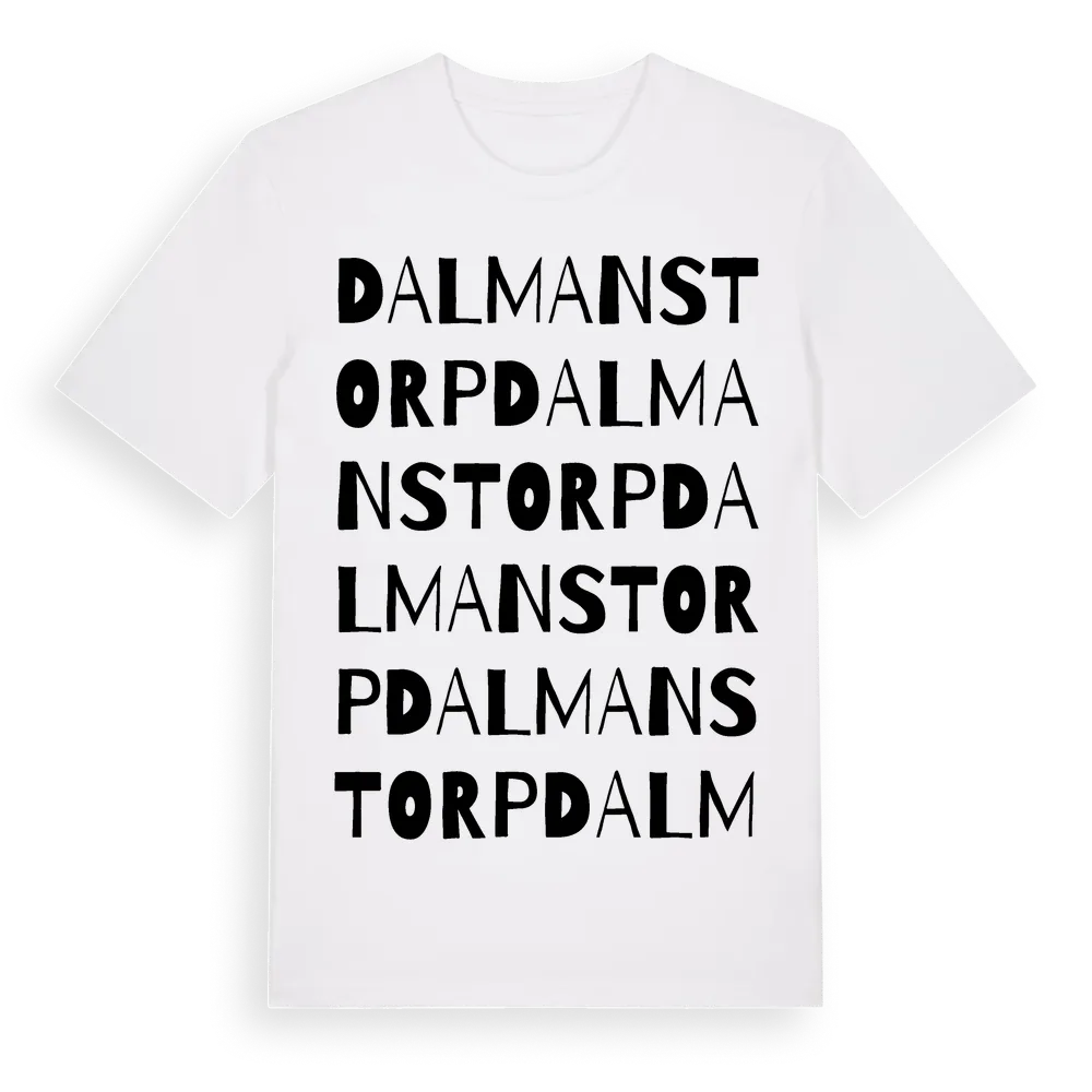 Dalmanstorp ordlek t-shirt är inspirerad av Dalmanstorp i Jönköpings län, Sverige. Tröjan är designad för dig som har en speciell koppling till platsen – oavsett om du bor här, har rötterna här eller bara älskar Dalmanstorp.