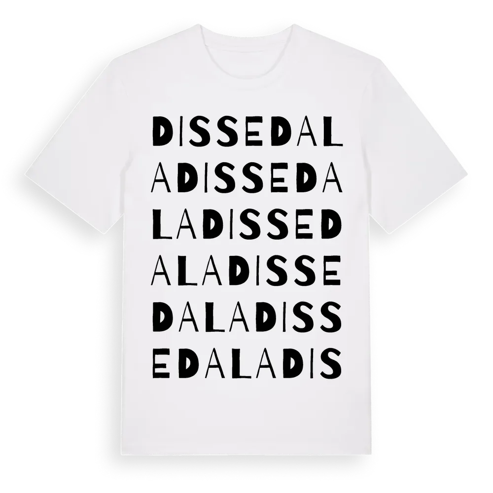 Dissedala ordlek t-shirt är inspirerad av byn Dissedala i Jönköpings län, Sverige. Tröjan är designad för dig som har en speciell koppling till platsen – oavsett om du bor här, har rötterna här eller bara älskar Dissedala.