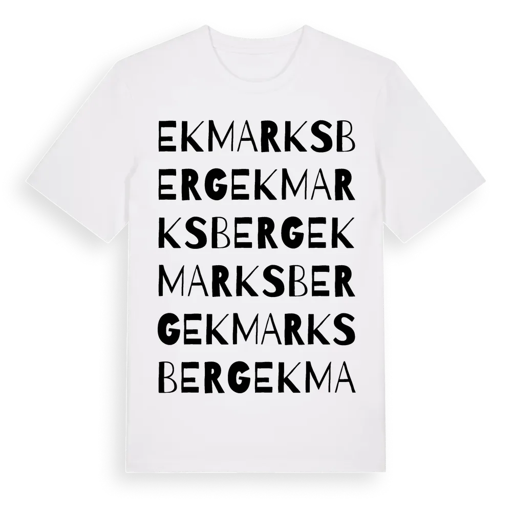 Ekmarksberg ordlek t-shirt är inspirerad av stadsdelen Ekmarksberg i Jönköpings län, Sverige. Tröjan är designad för dig som har en speciell koppling till platsen – oavsett om du bor här, har rötterna här eller bara älskar Ekmarksberg.