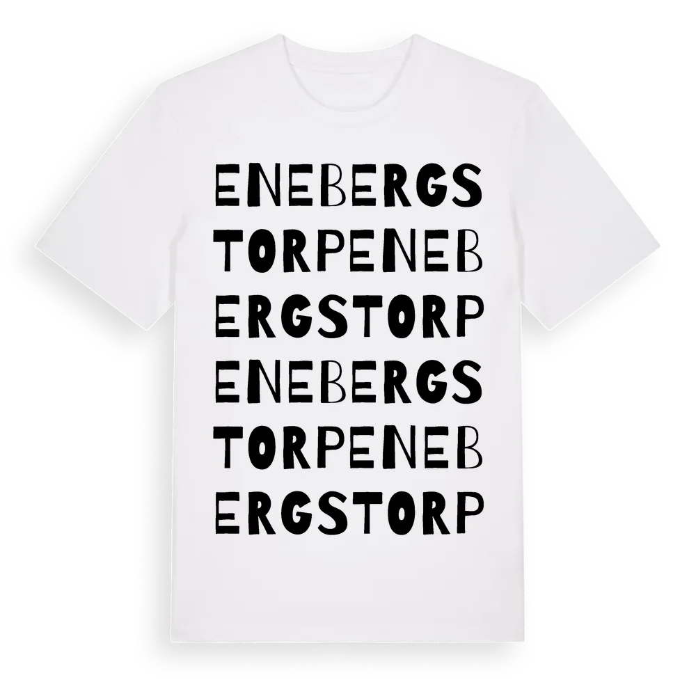 Enebergstorp ordlek t-shirt är inspirerad av Enebergstorp i Jönköpings län, Sverige. Tröjan är designad för dig som har en speciell koppling till platsen – oavsett om du bor här, har rötterna här eller bara älskar Enebergstorp.