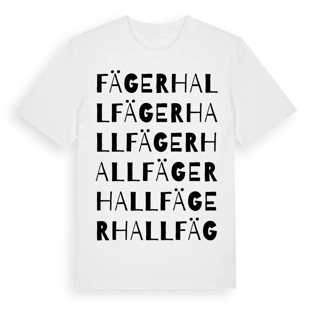 En ordlek byggd på Fägerhalls namn. Subtilt och klurig – ett motiv som bara de som verkligen känner platsen fullt ut förstår. Premium bomull, unisex – från Fägerhall i Jönköpings län.