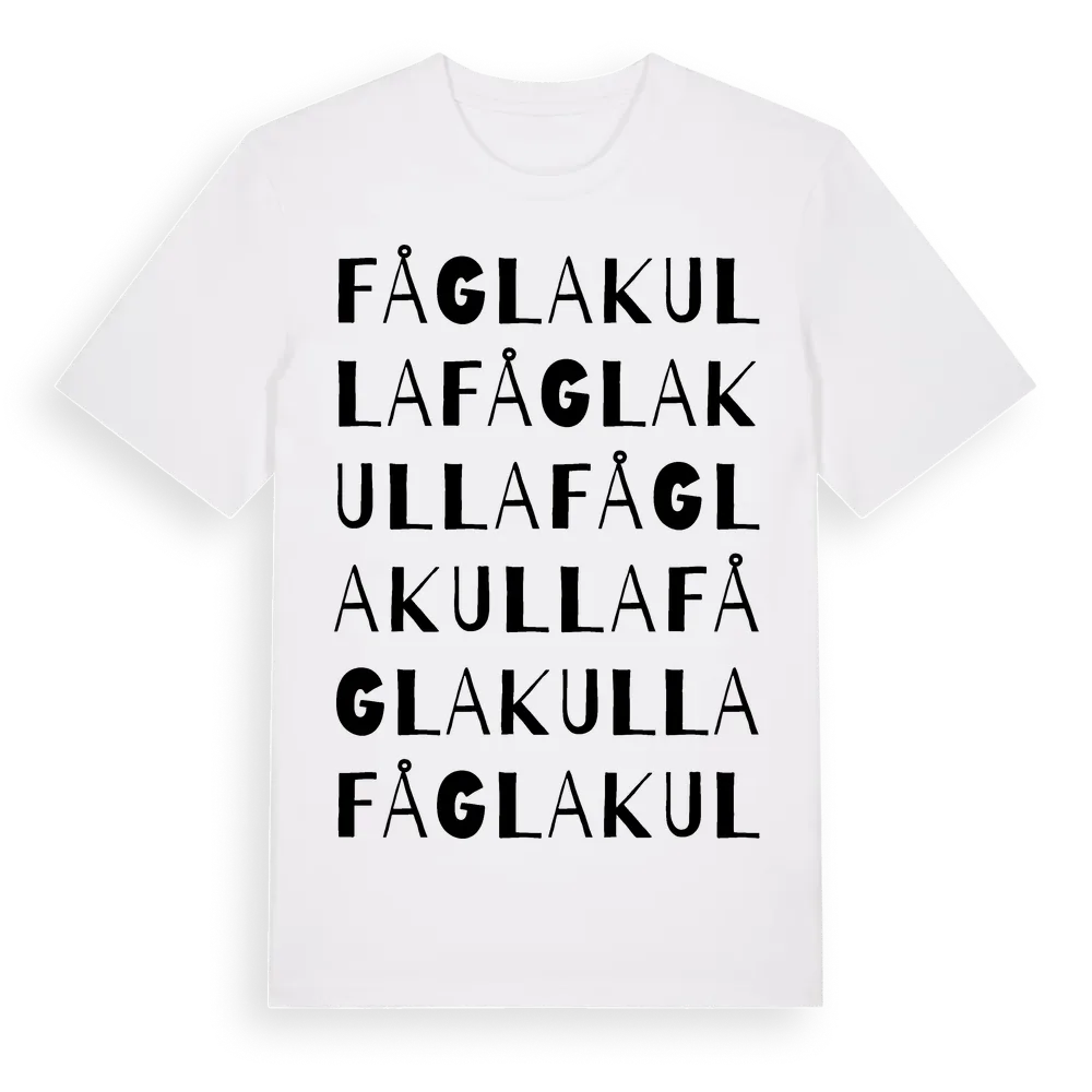 Fåglakulla ordlek t-shirt är inspirerad av byn Fåglakulla i Jönköpings län, Sverige. Tröjan är designad för dig som har en speciell koppling till platsen – oavsett om du bor här, har rötterna här eller bara älskar Fåglakulla.