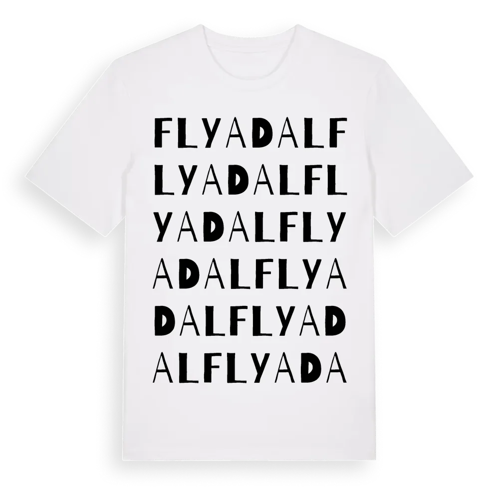 En ordlek byggd på Flyadals namn. Subtilt och klurig – ett motiv som bara de som verkligen känner platsen fullt ut förstår. Premium bomull, unisex – från Flyadal i Jönköpings län.