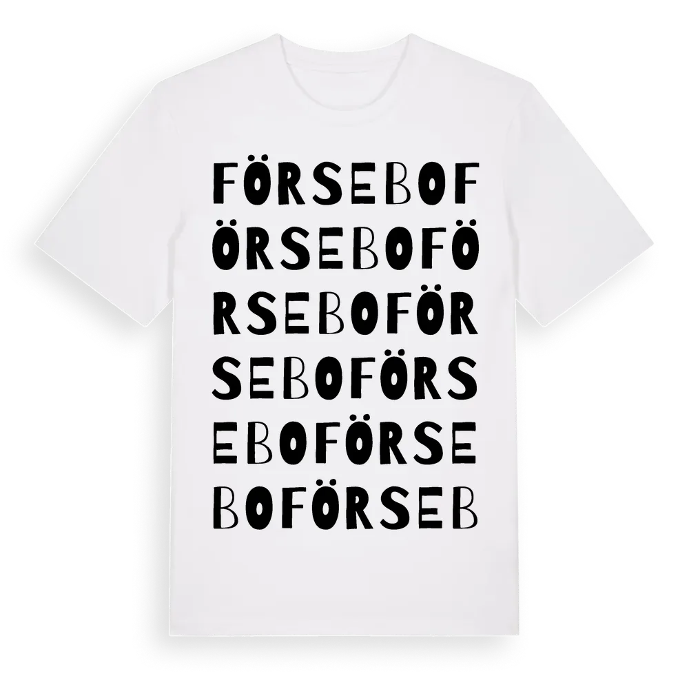Försebo ordlek t-shirt är inspirerad av byn Försebo i Jönköpings län, Sverige. Tröjan är designad för dig som har en speciell koppling till platsen – oavsett om du bor här, har rötterna här eller bara älskar Försebo.