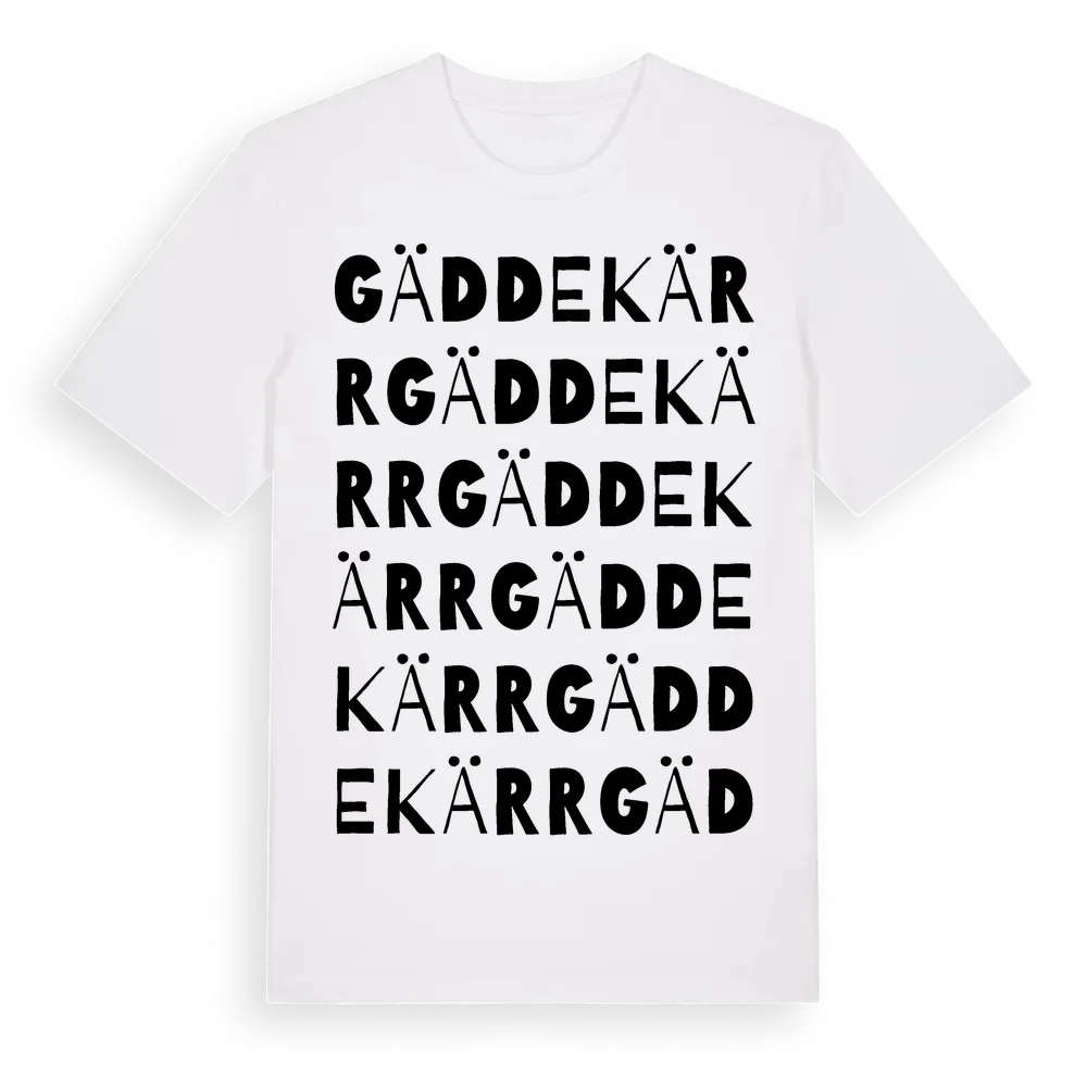Gäddekärr ordlek t-shirt är inspirerad av Gäddekärr i Jönköpings län, Sverige. Tröjan är designad för dig som har en speciell koppling till platsen – oavsett om du bor här, har rötterna här eller bara älskar Gäddekärr.