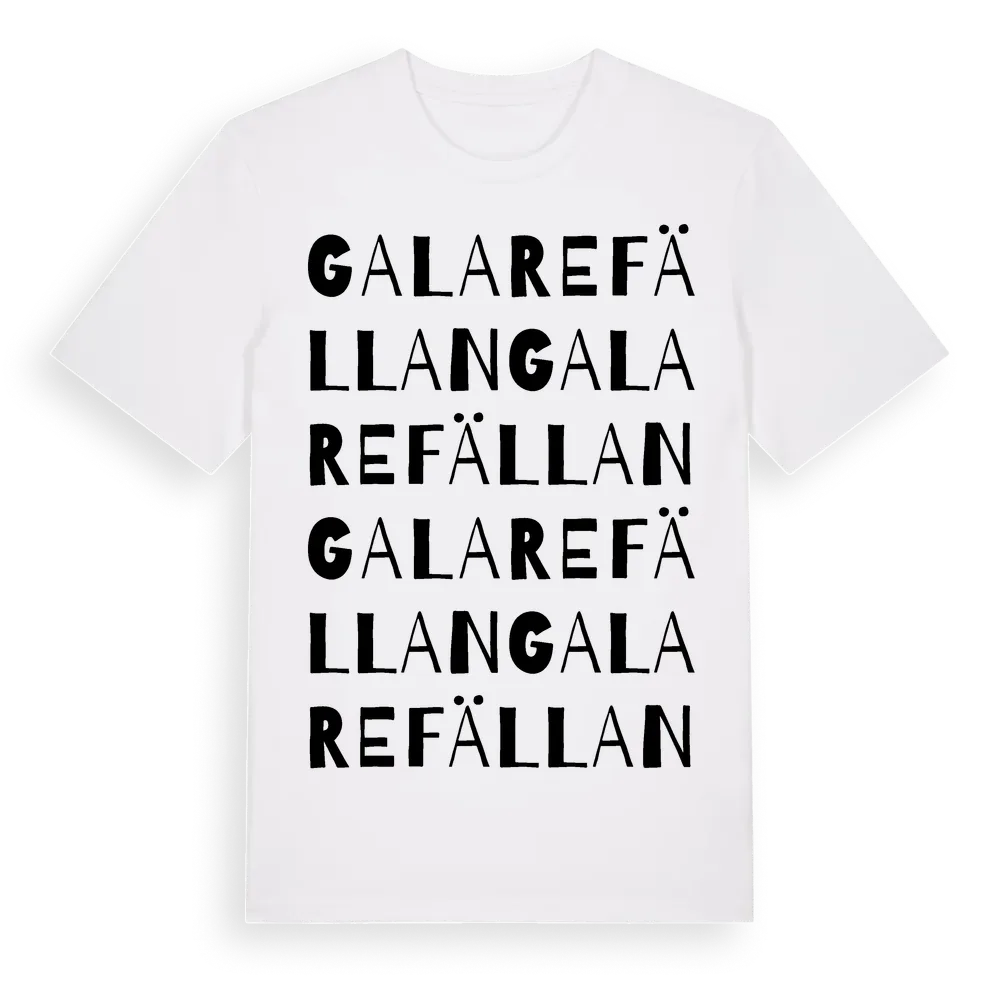 Galarefällan ordlek t-shirt är inspirerad av Galarefällan i Jönköpings län, Sverige. Tröjan är designad för dig som har en speciell koppling till platsen – oavsett om du bor här, har rötterna här eller bara älskar Galarefällan.