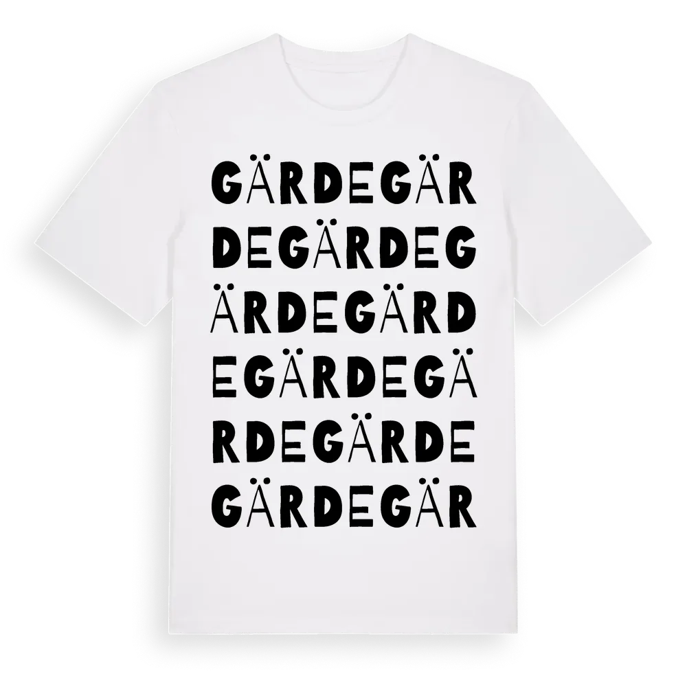 Gärde ordlek t-shirt är inspirerad av byn Gärde i Jönköpings län, Sverige. Tröjan är designad för dig som har en speciell koppling till platsen – oavsett om du bor här, har rötterna här eller bara älskar Gärde.