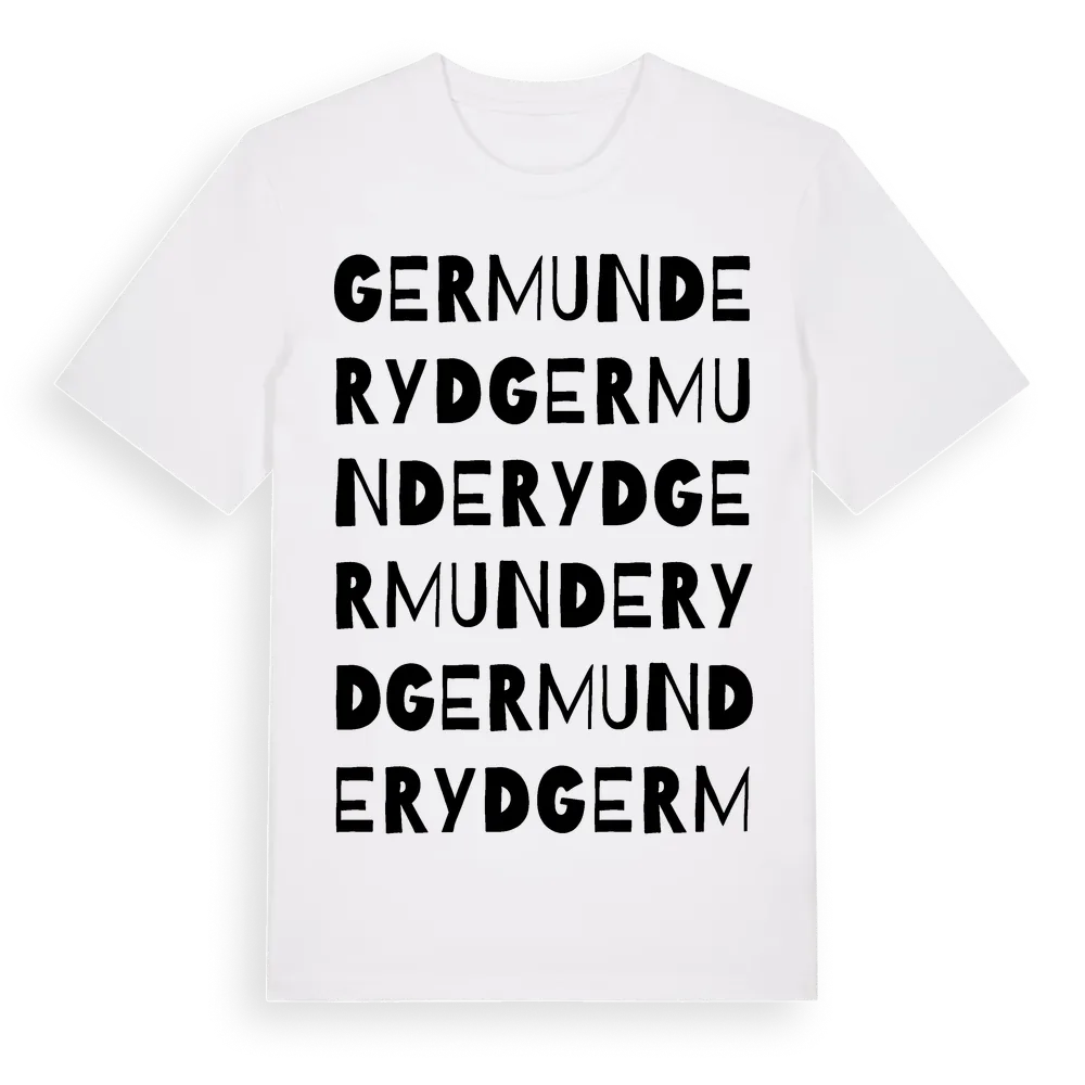 Germunderyd ordlek t-shirt är inspirerad av byn Germunderyd i Jönköpings län, Sverige. Tröjan är designad för dig som har en speciell koppling till platsen – oavsett om du bor här, har rötterna här eller bara älskar Germunderyd.