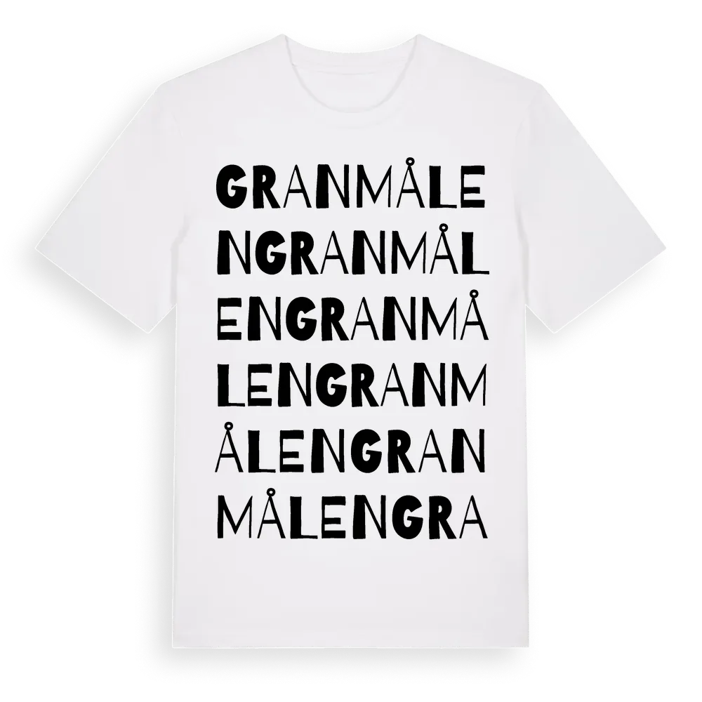 Granmålen ordlek t-shirt är inspirerad av Granmålen i Jönköpings län, Sverige. Tröjan är designad för dig som har en speciell koppling till platsen – oavsett om du bor här, har rötterna här eller bara älskar Granmålen.