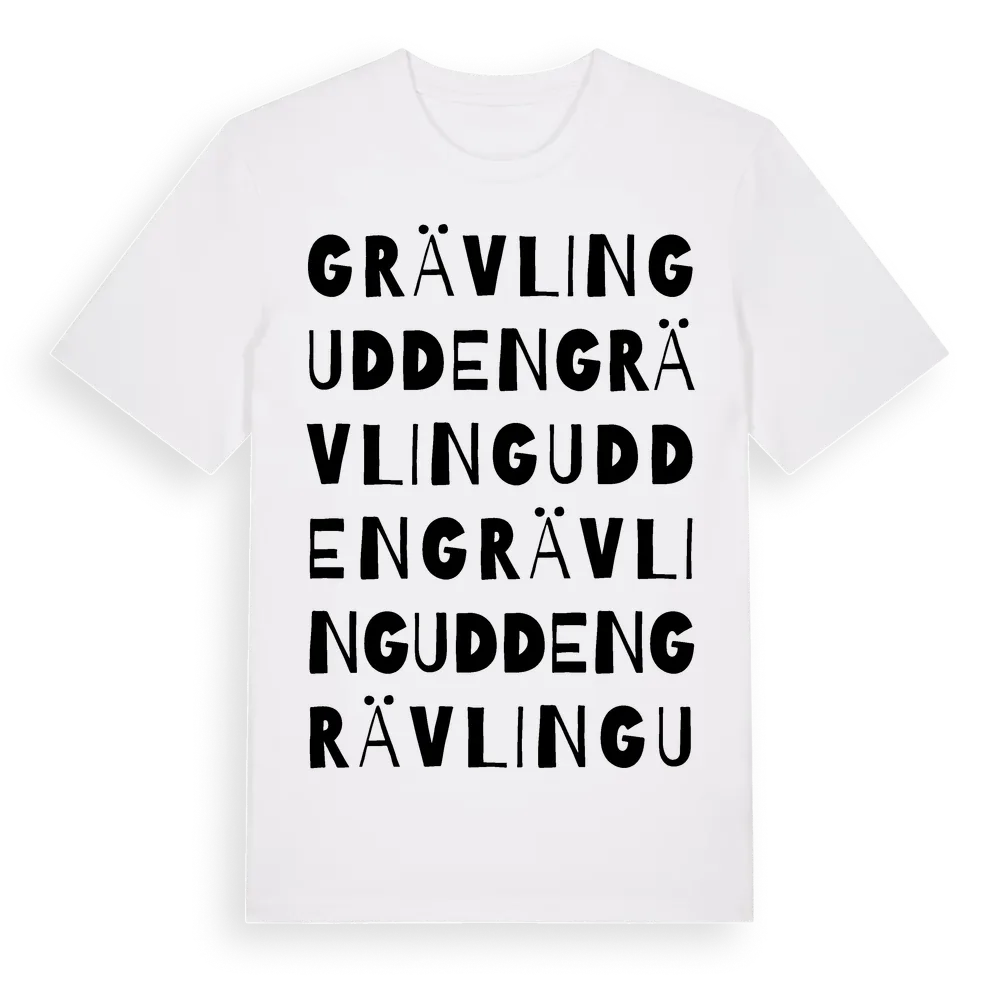 En ordlek byggd på Grävlinguddens namn. Subtilt och klurig – ett motiv som bara de som verkligen känner platsen fullt ut förstår. Premium bomull, unisex – från Grävlingudden i Jönköpings län.