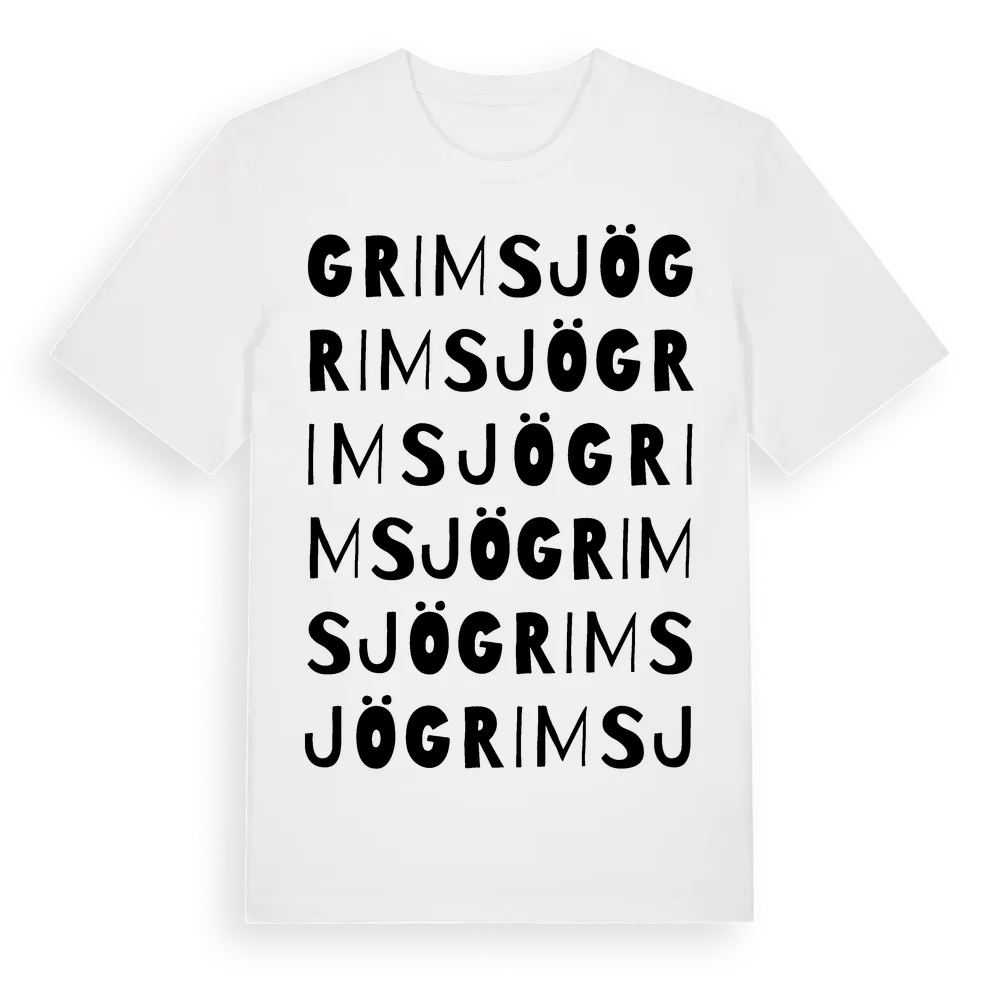 Grimsjö ordlek t-shirt är inspirerad av byn Grimsjö i Jönköpings län, Sverige. Tröjan är designad för dig som har en speciell koppling till platsen – oavsett om du bor här, har rötterna här eller bara älskar Grimsjö.