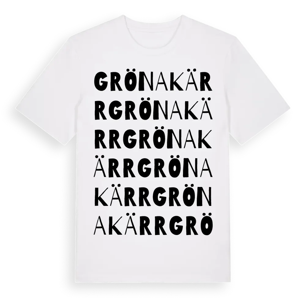 Gröna Kärr ordlek t-shirt är inspirerad av Gröna Kärr i Jönköpings län, Sverige. Tröjan är designad för dig som har en speciell koppling till platsen – oavsett om du bor här, har rötterna här eller bara älskar Gröna Kärr.