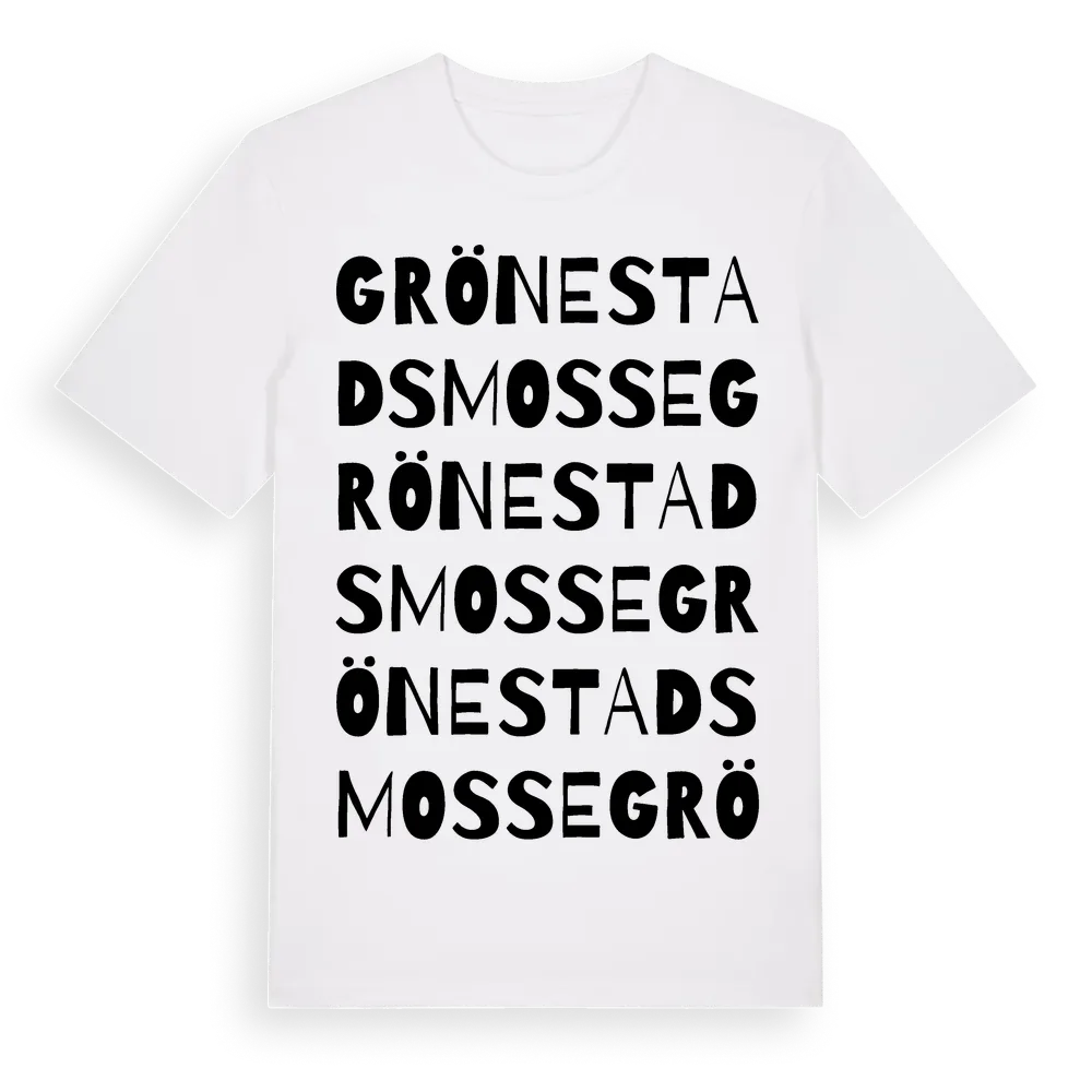 Grönestads Mosse ordlek t-shirt är inspirerad av Grönestads Mosse i Jönköpings län, Sverige. Tröjan är designad för dig som har en speciell koppling till platsen – oavsett om du bor här, har rötterna här eller bara älskar Grönestads Mosse.