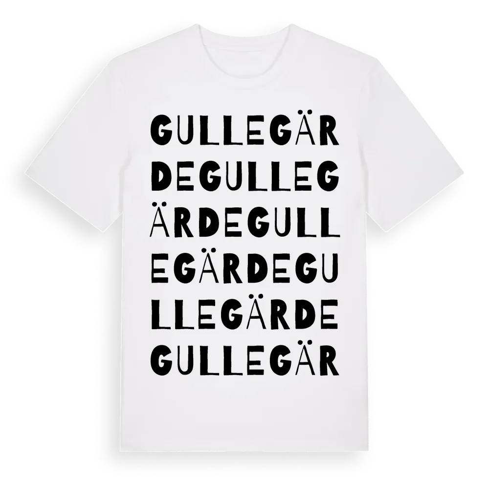 Gullegärde ordlek t-shirt är inspirerad av Gullegärde i Jönköpings län, Sverige. Tröjan är designad för dig som har en speciell koppling till platsen – oavsett om du bor här, har rötterna här eller bara älskar Gullegärde.