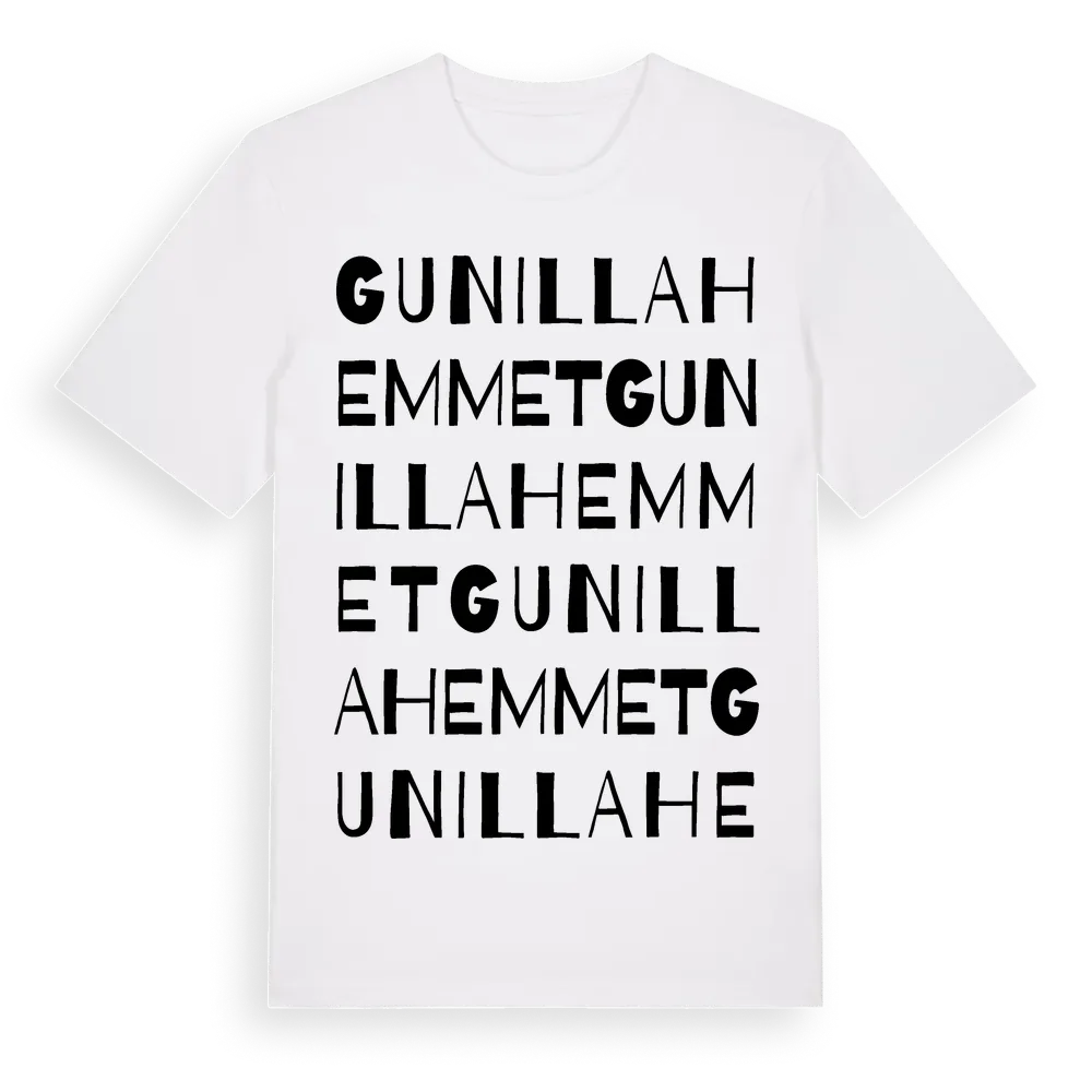 Gunillahemmet ordlek t-shirt är inspirerad av Gunillahemmet i Jönköpings län, Sverige. Tröjan är designad för dig som har en speciell koppling till platsen – oavsett om du bor här, har rötterna här eller bara älskar Gunillahemmet.