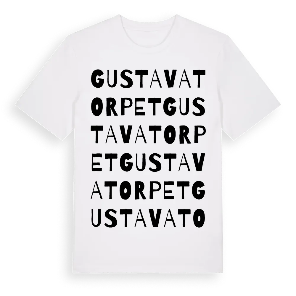 Gustavatorpet ordlek t-shirt är inspirerad av Gustavatorpet i Jönköpings län, Sverige. Tröjan är designad för dig som har en speciell koppling till platsen – oavsett om du bor här, har rötterna här eller bara älskar Gustavatorpet.